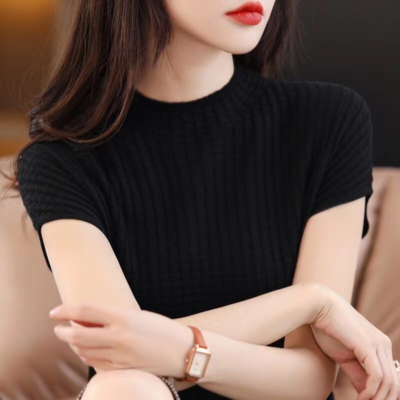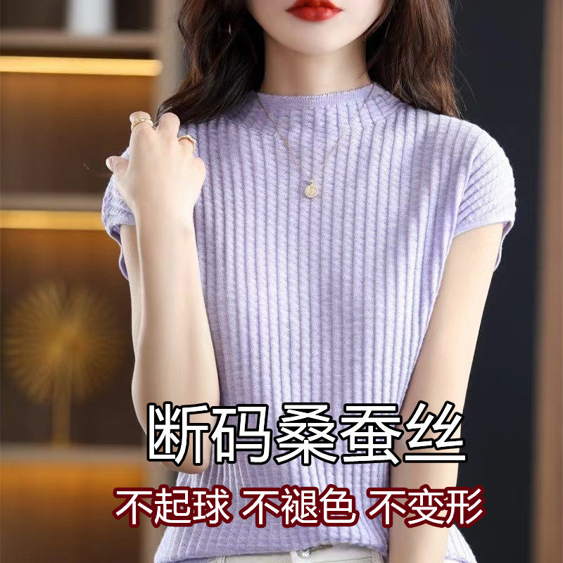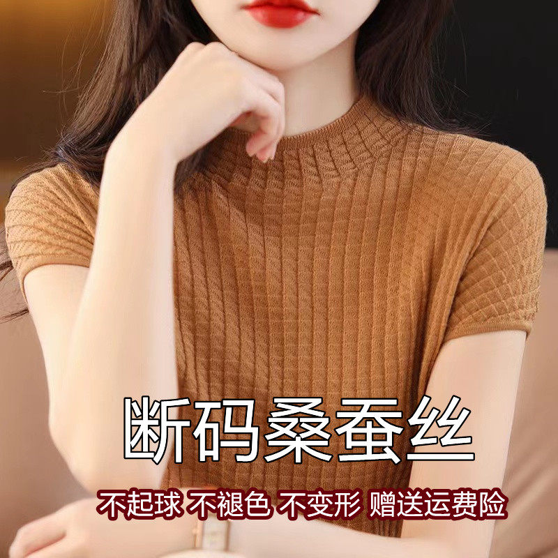 百搭冰丝打底衫 薄款 新款 t恤女半高领夏季 白色上衣 100%桑蚕丝短袖