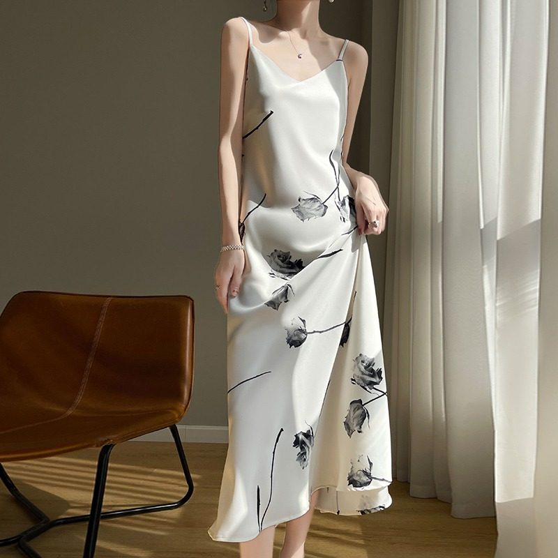 重磅真丝连衣裙女V领桑蚕丝吊带裙醋酸爆款 打底印花睡裙长裙 夏季