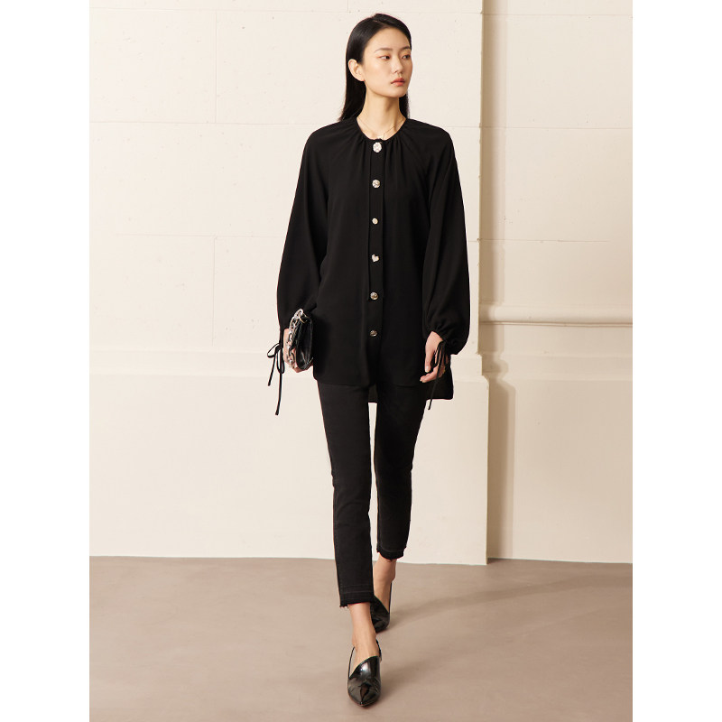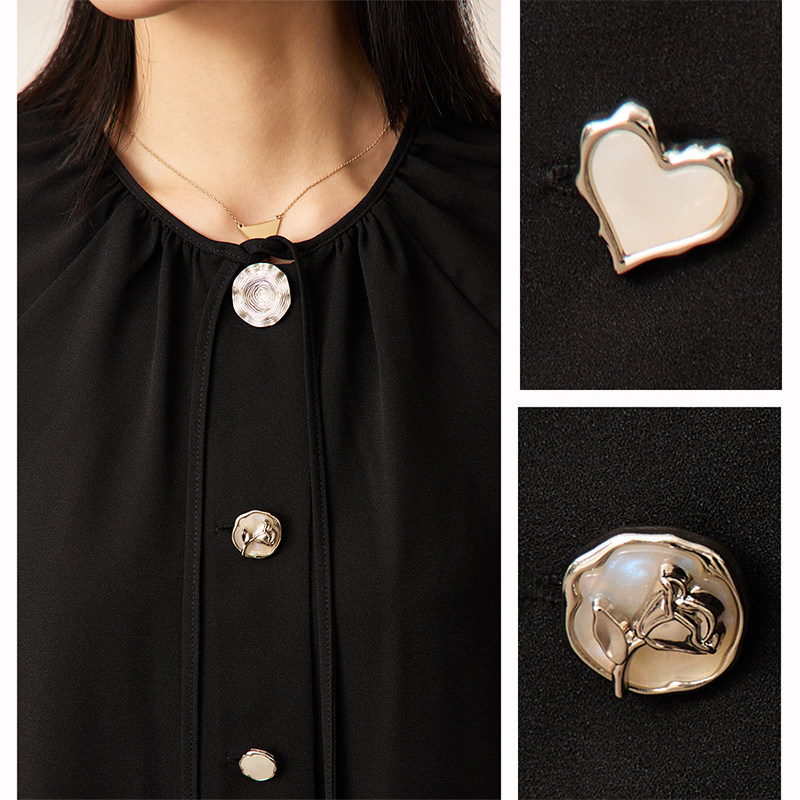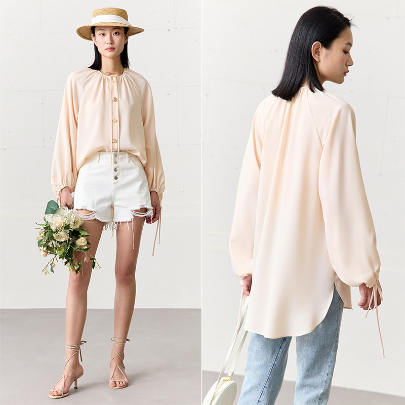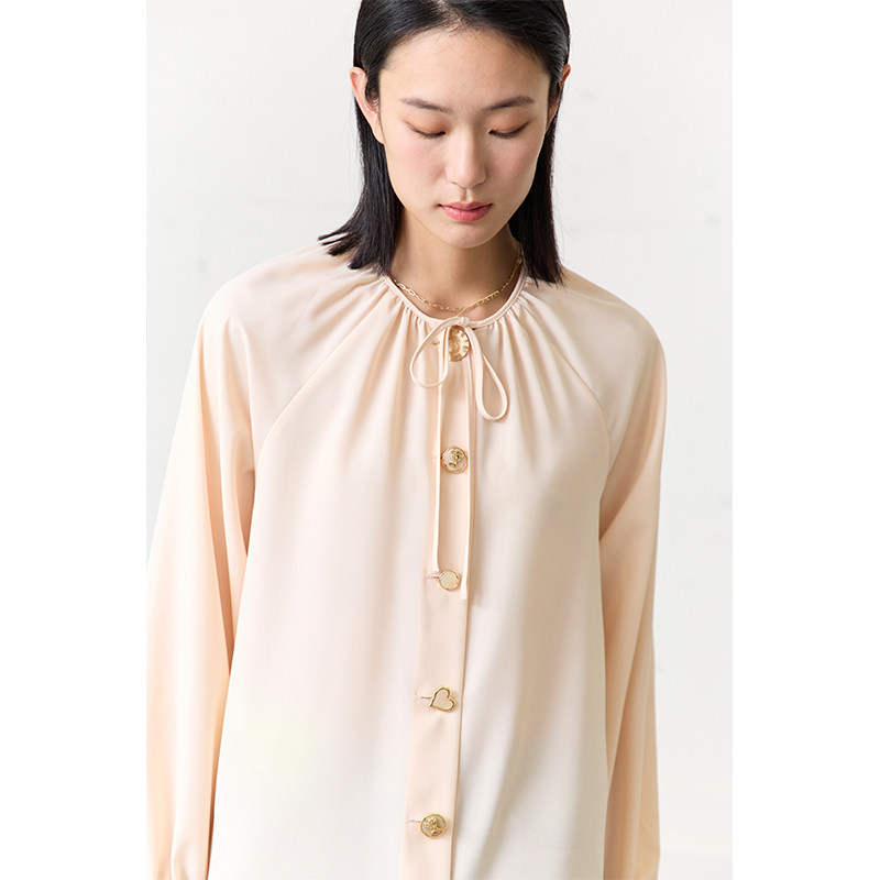 女上衣别致漂亮洋气小衫 Amii2026夏新款 圆领异形扣碎褶绑带雪纺衫