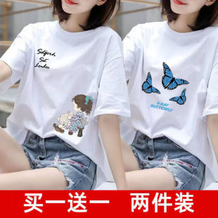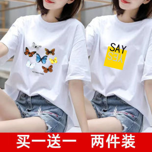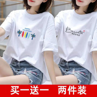 韩版 买一送一两件装 t恤女夏装 短袖 胖mm宽松上衣女白色2023夏 大码