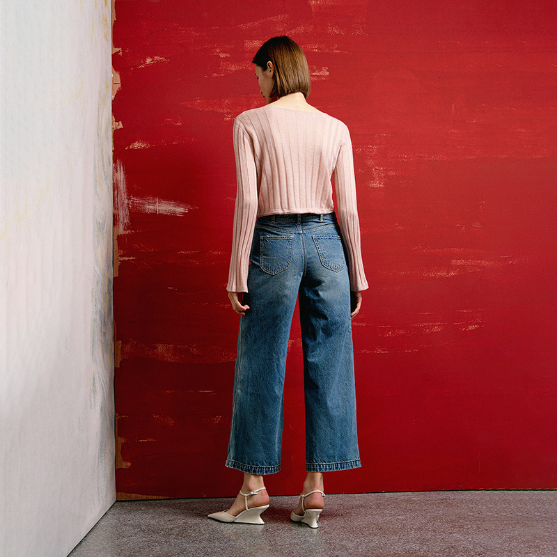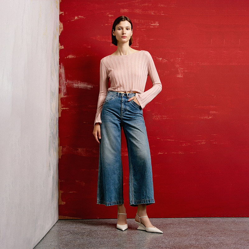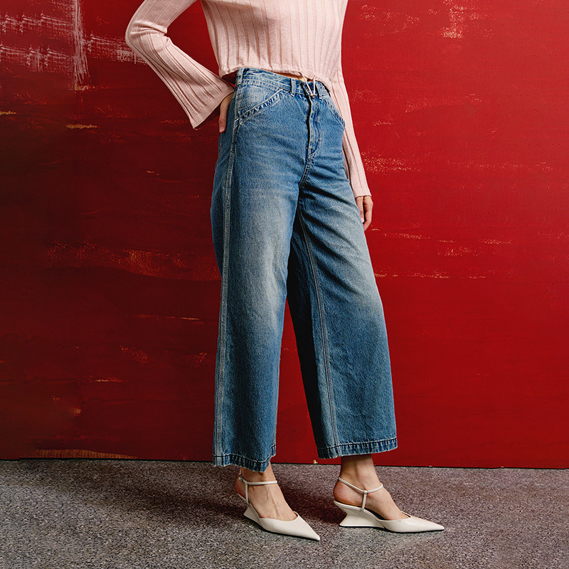 休闲时髦高腰棉质阔腿牛仔裤 BLUE轻奢优雅女装