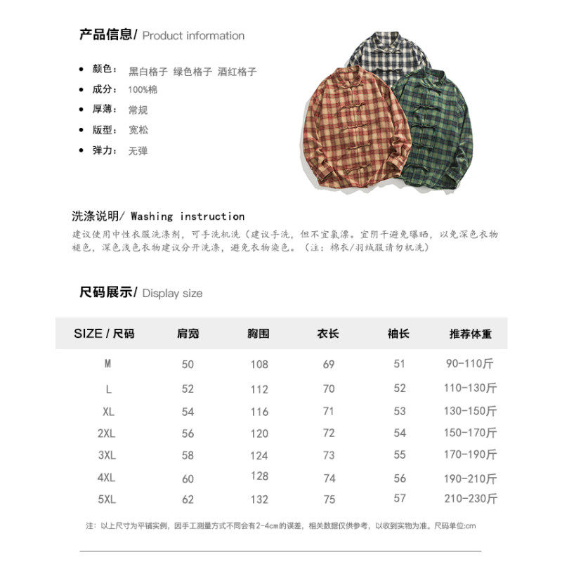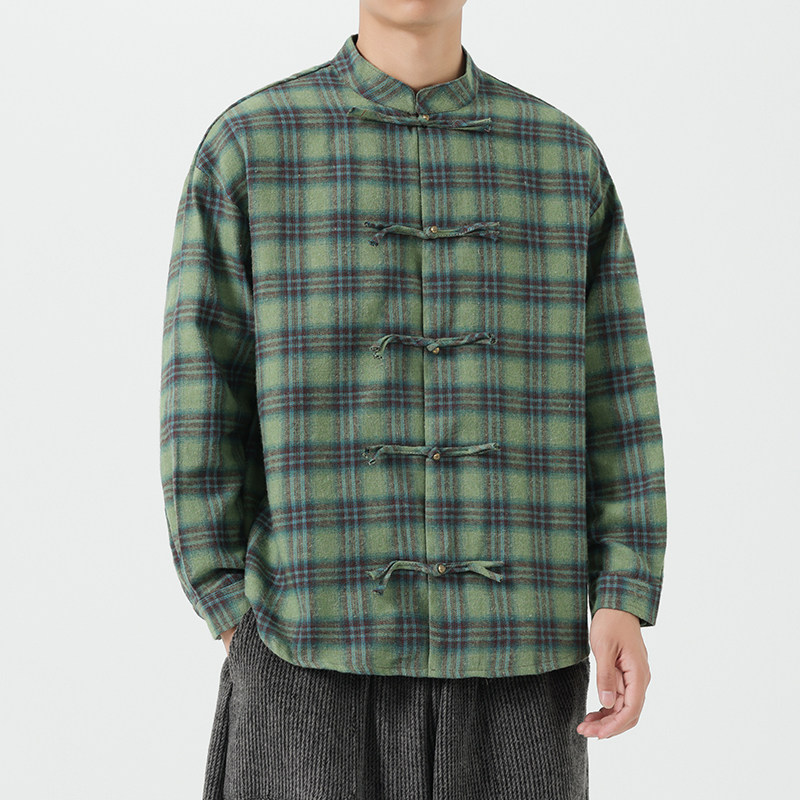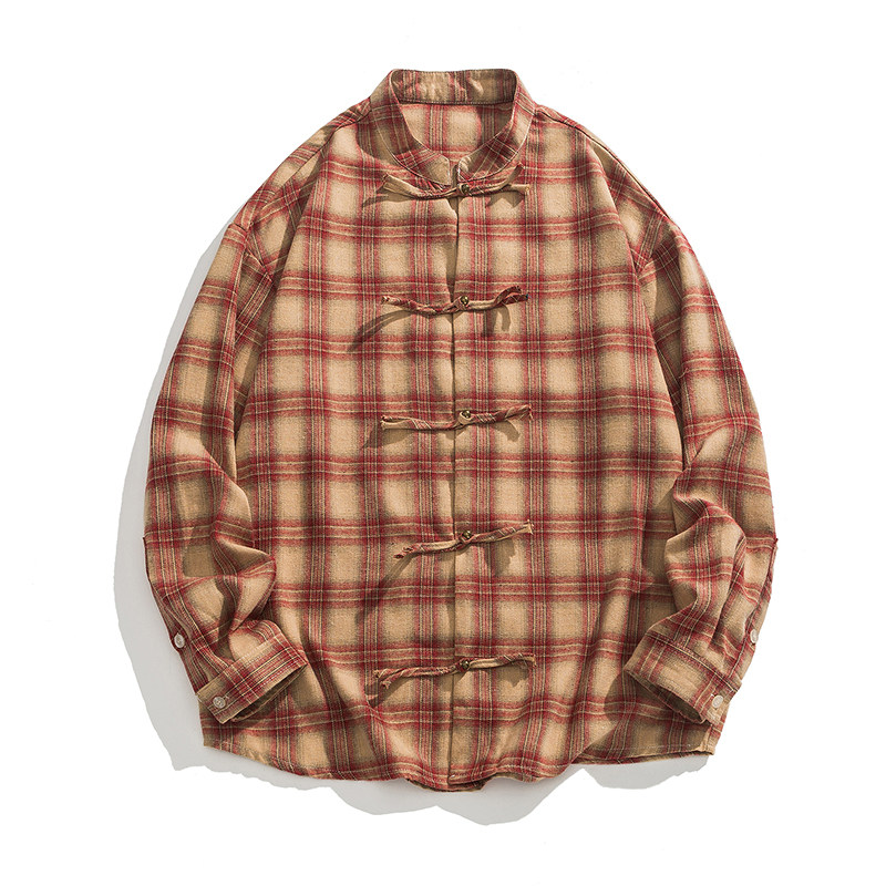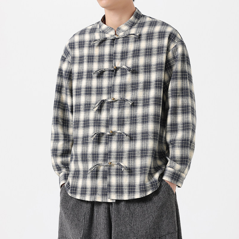 男2025早秋新款 衬衫 复古潮牌纯棉防晒衬衣外套 盘扣格子长袖 新中式
