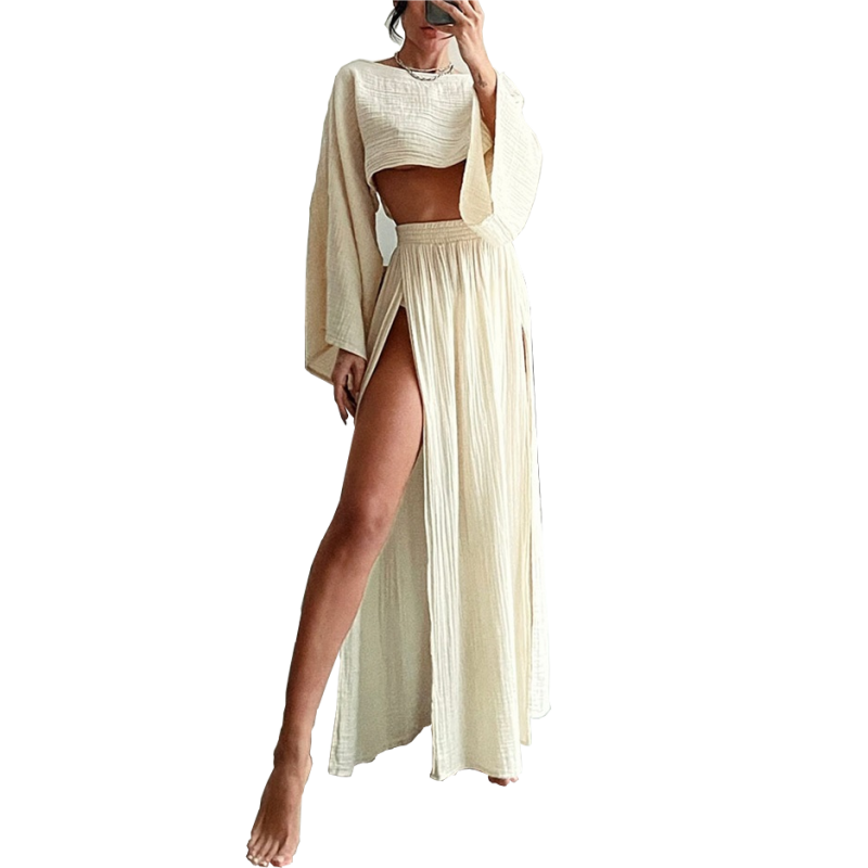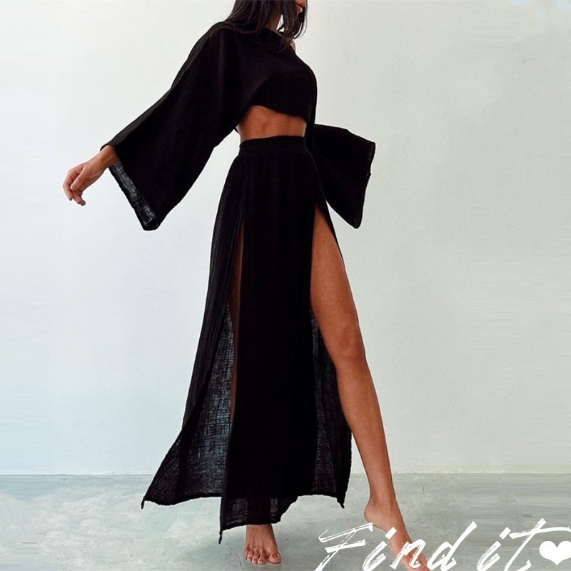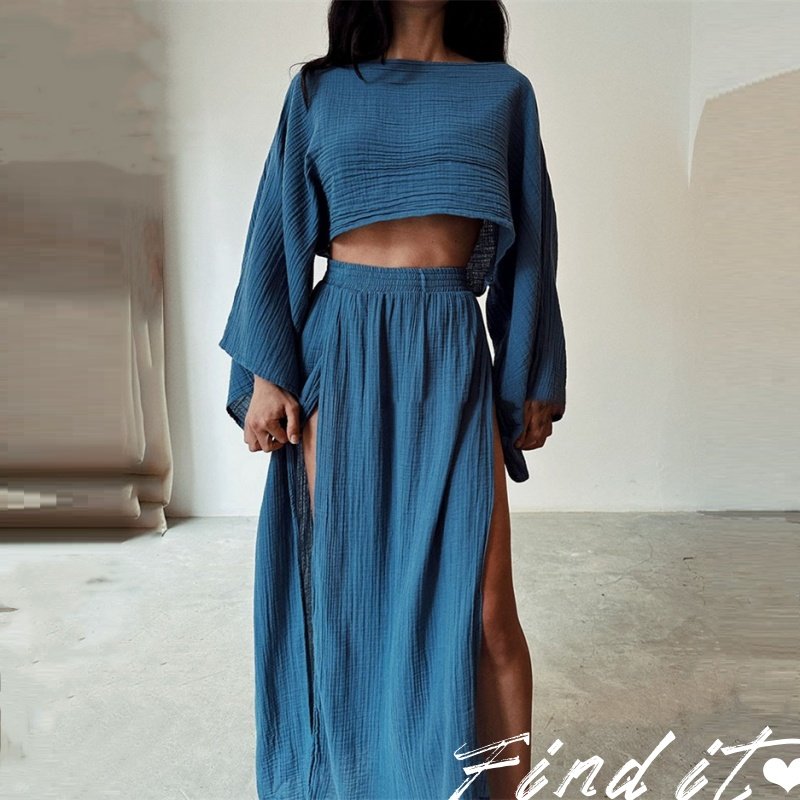高腰开衩长裙棉麻套装 上衣 纯纱棉透气短款 Find休闲度假风2件套