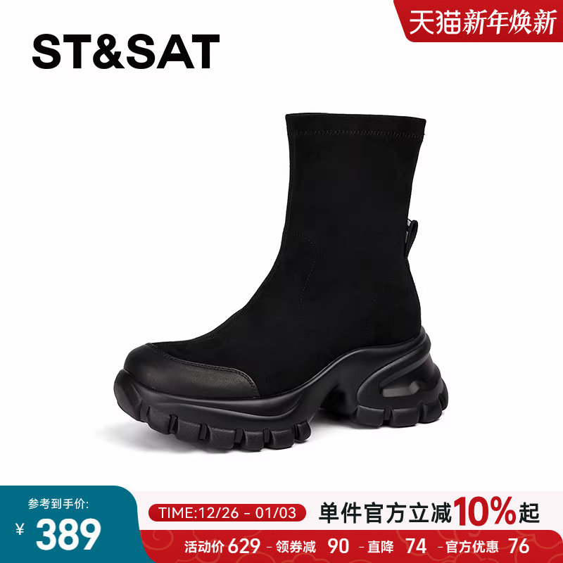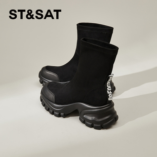 星期六厚底袜靴女2025新款 秋冬加绒小个子弹力瘦瘦靴高跟马丁短靴