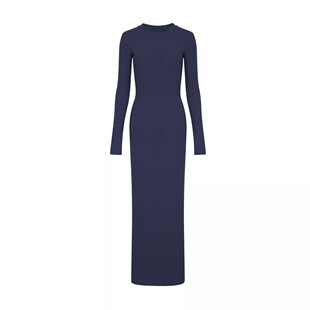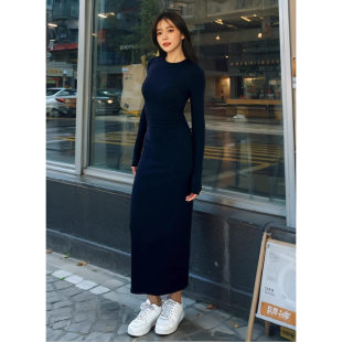 连衣裙辣妹修身 2025秋冬藏蓝色圆领长袖 包臀显瘦长裙女 棉罗纹