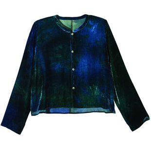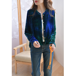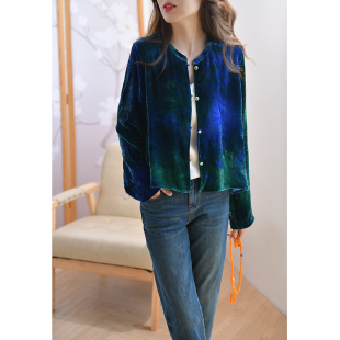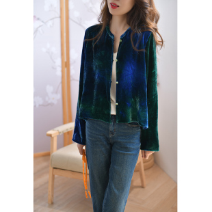 国风珠扣新中式 2025新款 上衣 外套女秋季 GESGOO蓝绿晕染真丝绒短款