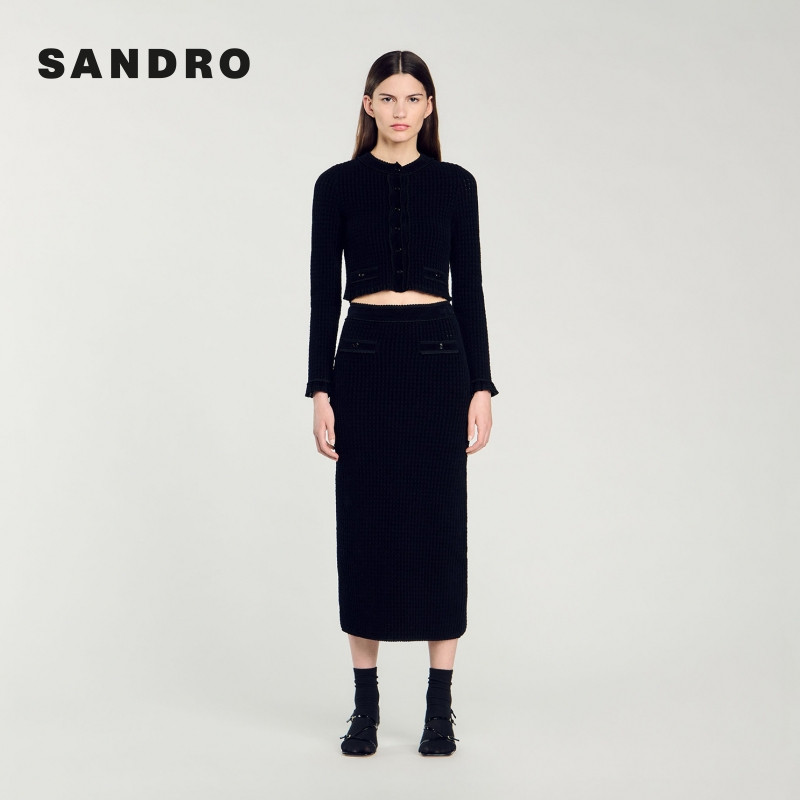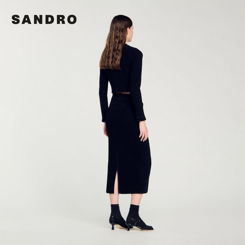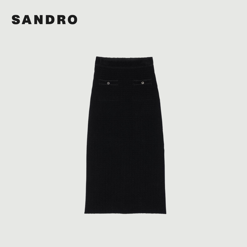 黑色花朵扣饰编织条纹修身 气质时尚 高腰半身裙 法式 SANDRO秋冬女装
