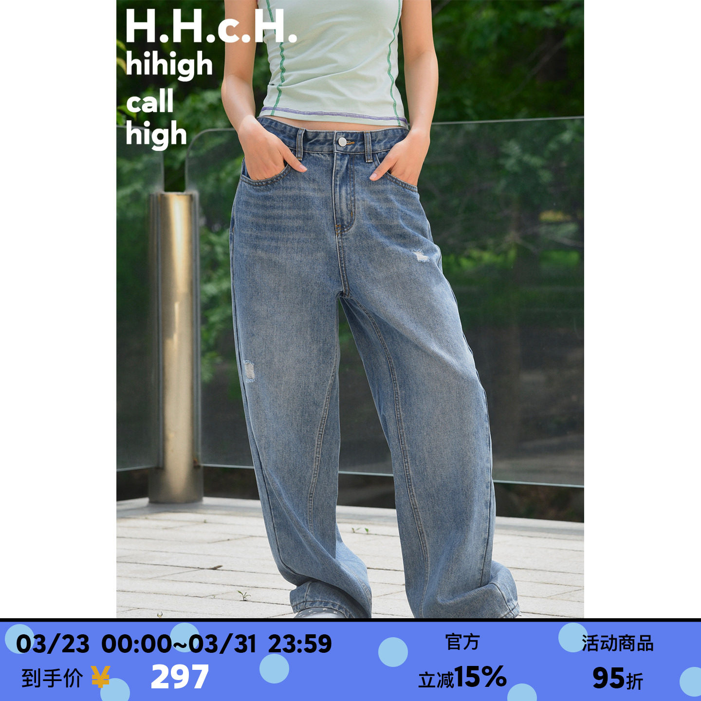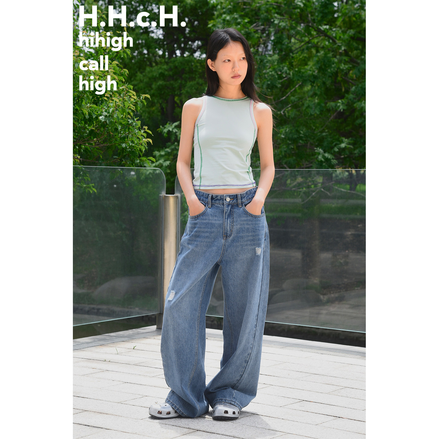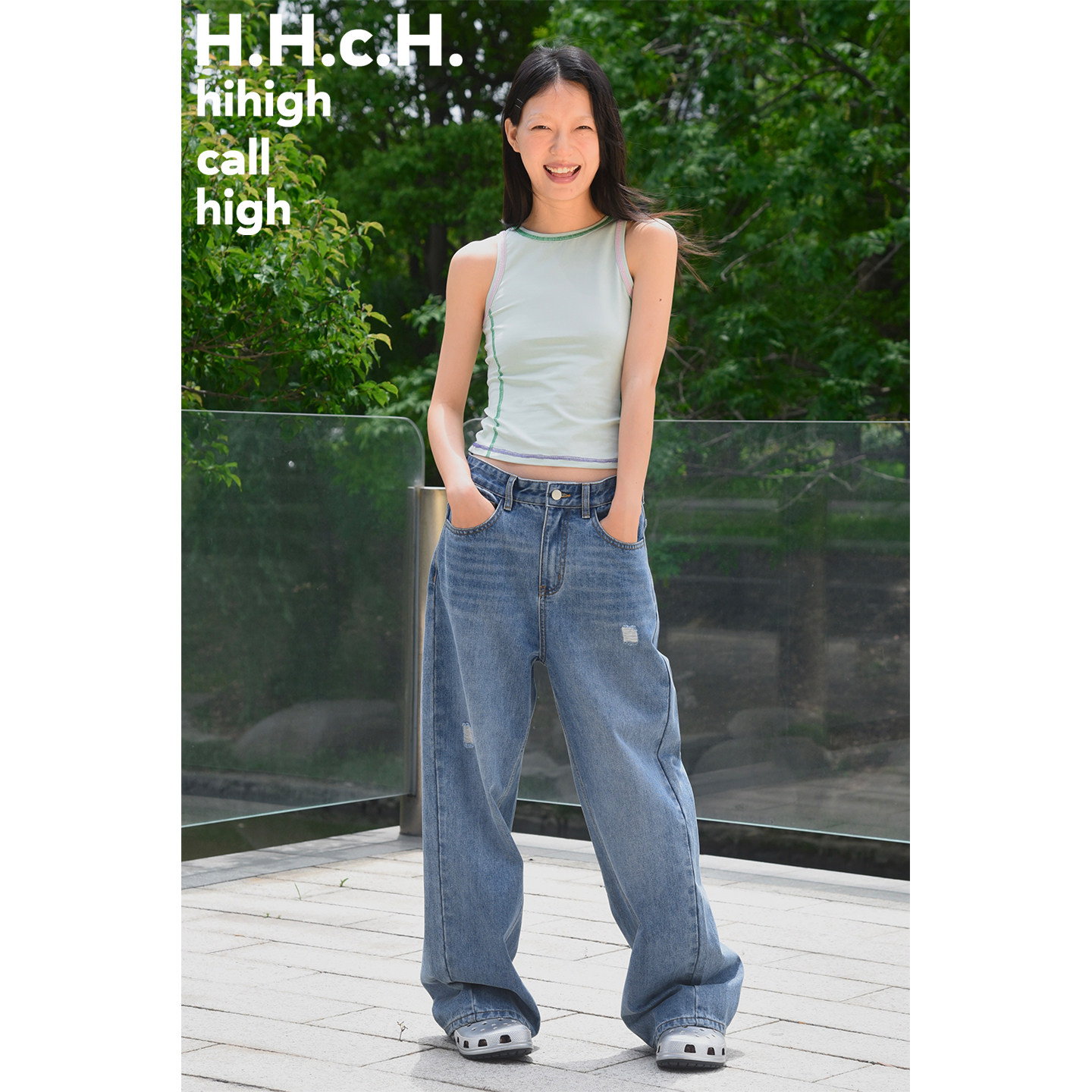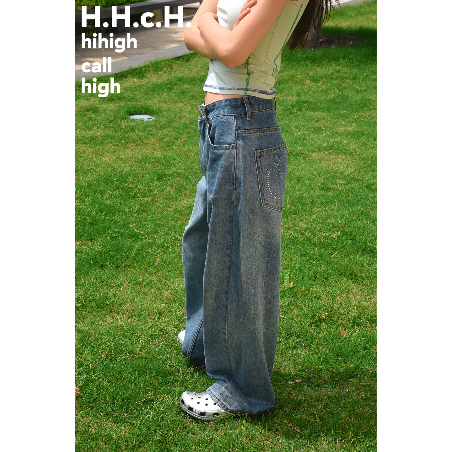 苹果图案烫钻慵懒低腰水洗磨破直筒宽松牛仔长裤 HHCH口海 25SS