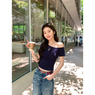 修身 t恤短款 女气质斜肩设计感正肩上衣 露肩短袖 pusumede穿搭秘籍