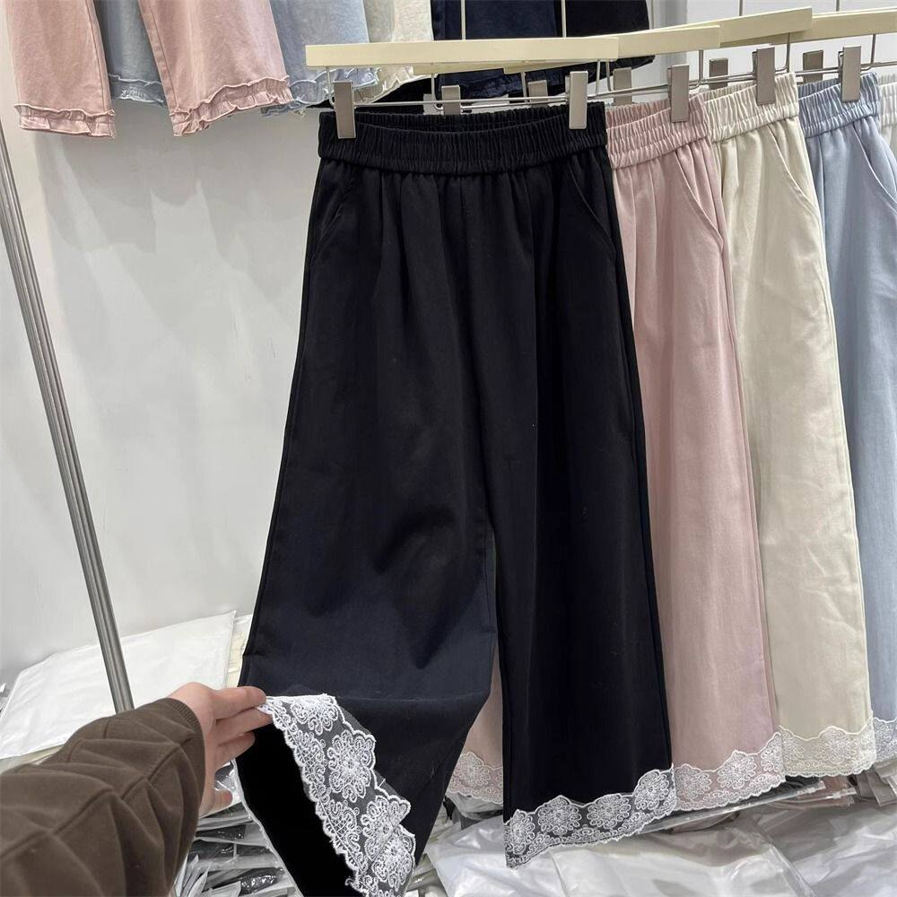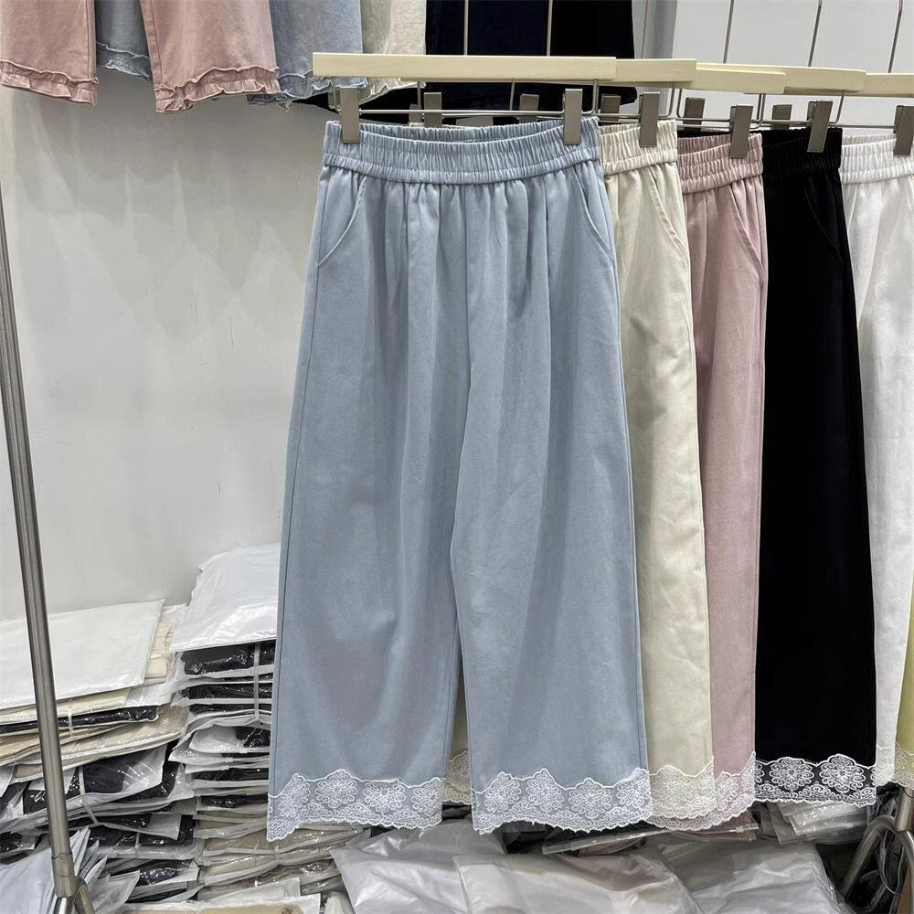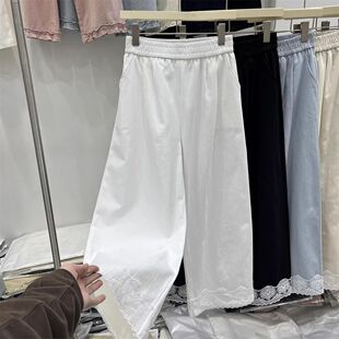 松紧腰阔腿裤 女纯色九分裤 子 高腰显瘦蕾丝拼接休闲裤 棉质妈妈韩版
