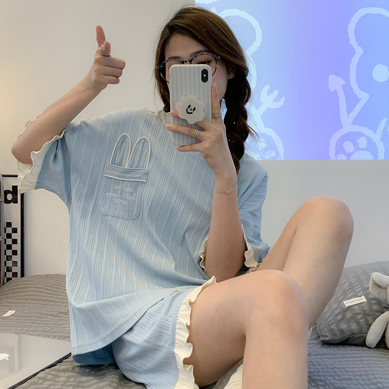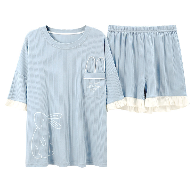 女士短袖 薄款 睡衣套装 家居服韩版 可外穿春秋休闲可爱卡通 大码 夏季