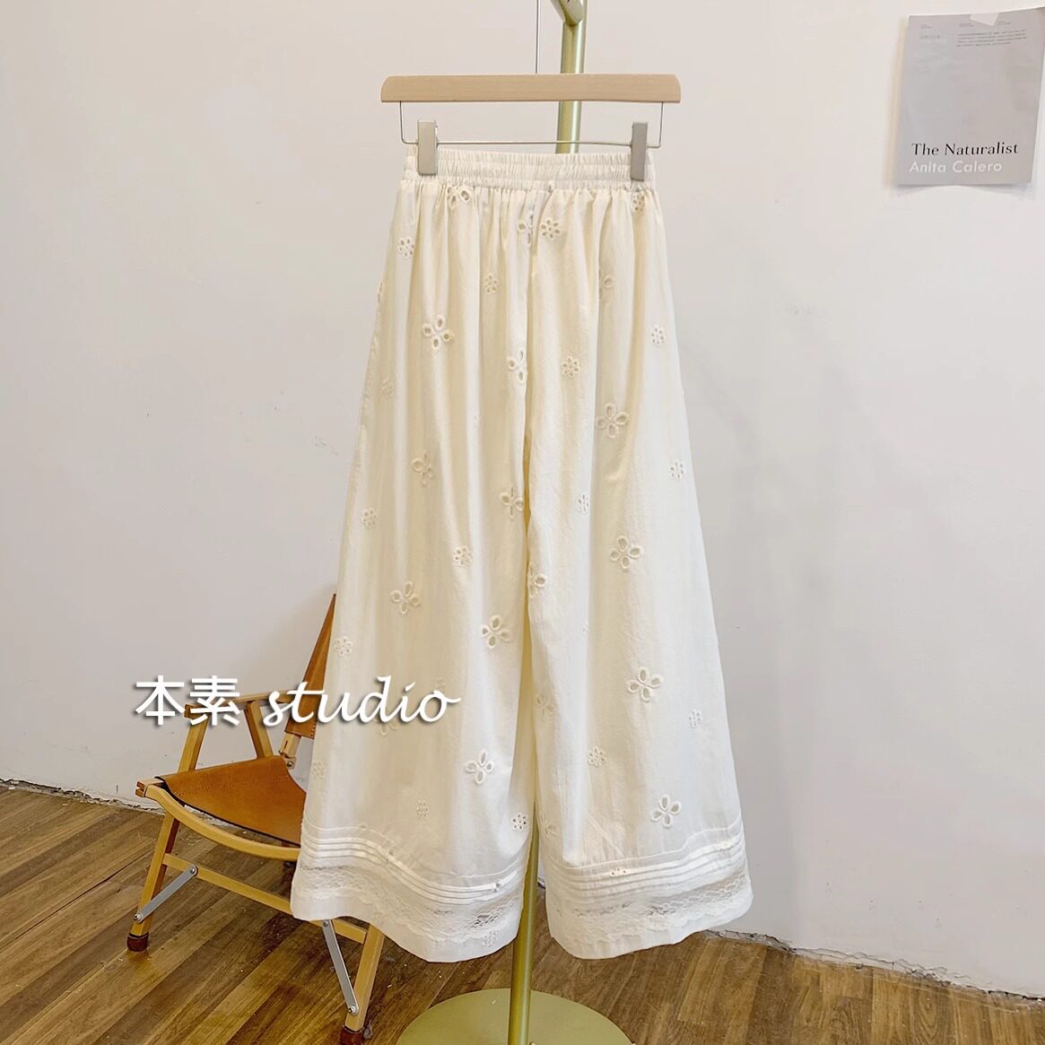 女春秋高腰显瘦垂感宽松长裤 大码 胖妹妹设计感镂空蕾丝拼接阔腿裤
