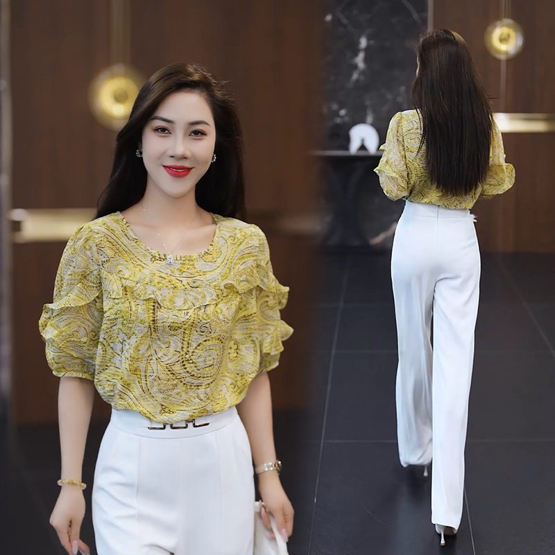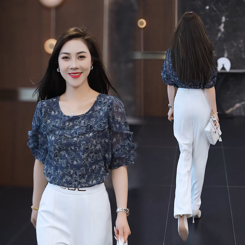 圆领小衫 雪纺衫 夏装 高端女遮肚子泡泡中袖 百搭荷叶边宽松洋气 短袖