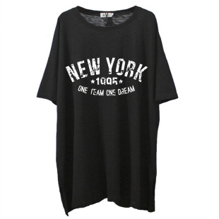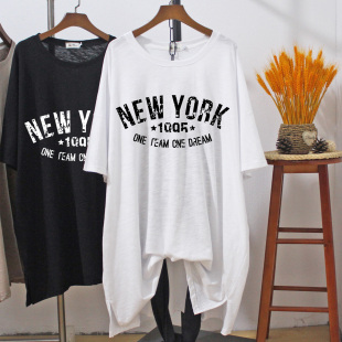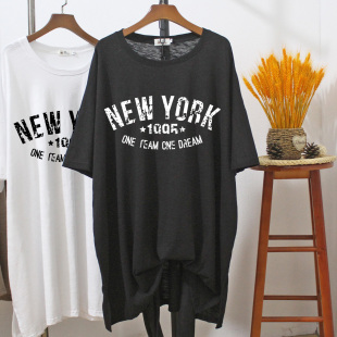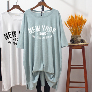 夏季 200斤长款 竹节棉印花t恤女慵懒风 胖mm显瘦遮肚子宽松大码 短袖