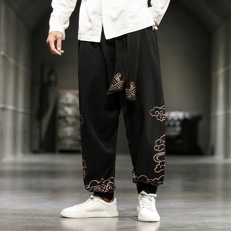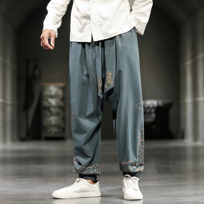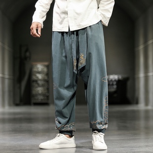 棉麻中国风刺绣休闲裤 复古哈伦裤 子男士 束脚灯笼裤 宽松大码 春秋季