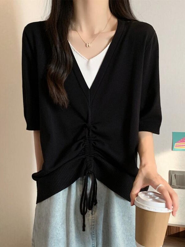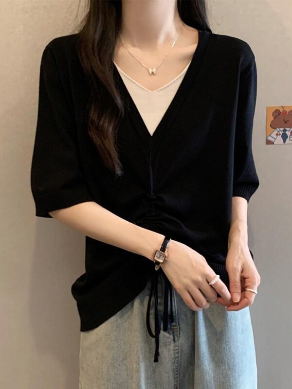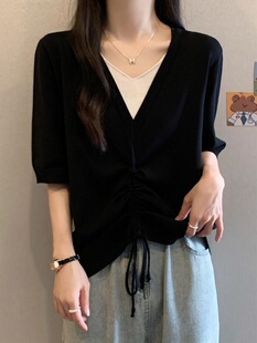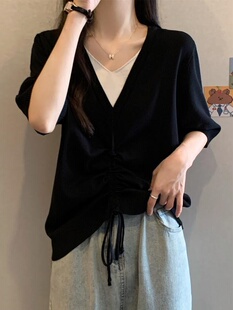 遮肉假两件上衣T恤夏季 韩系V领冰丝针织衫 300斤大码 胖妹妹2 女装
