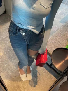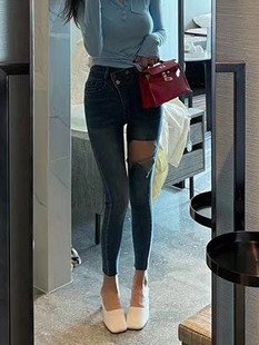 新款 女春季 百搭高腰修身 显瘦铅笔裤 韩版 小脚裤 破洞水洗蓝色牛仔裤