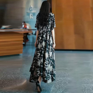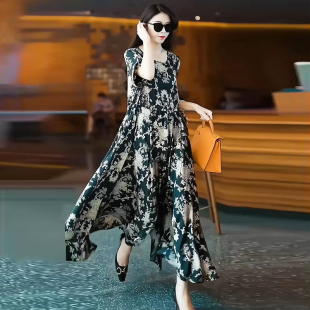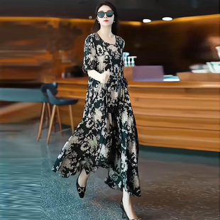 碎花裙高端奢华宽松遮肚减龄长裙 大码 时尚 真丝连衣裙2025春夏新款