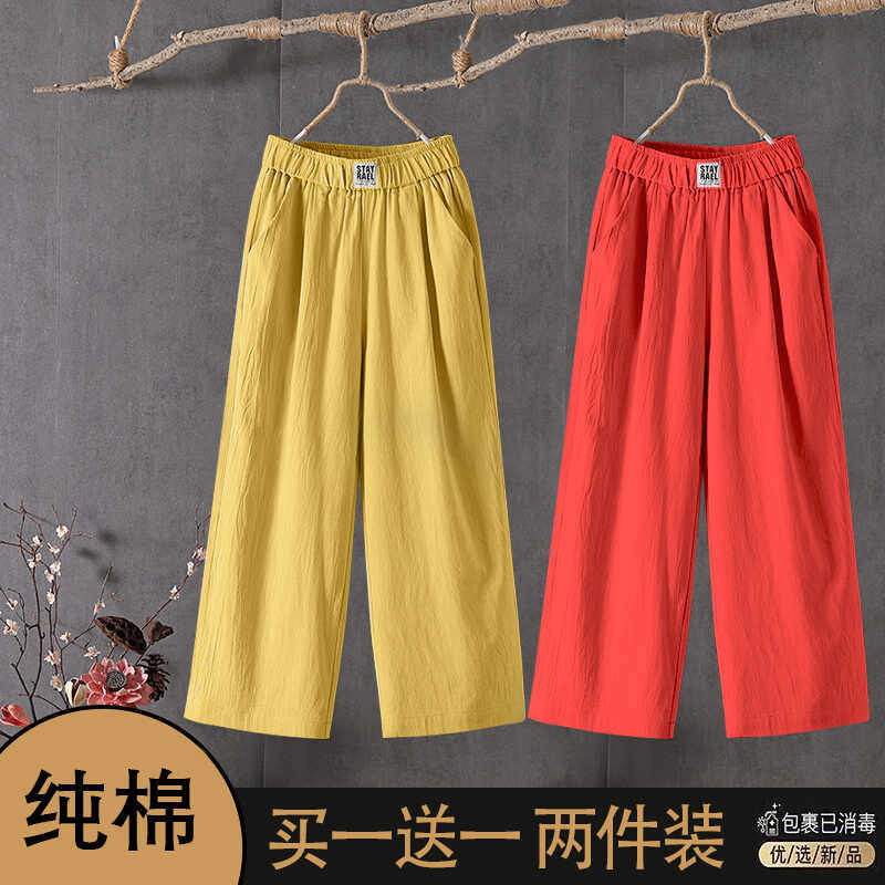 女2025新款 松紧腰九分裤 高腰垂感直筒休闲裤 春夏季 大码 棉麻阔腿裤