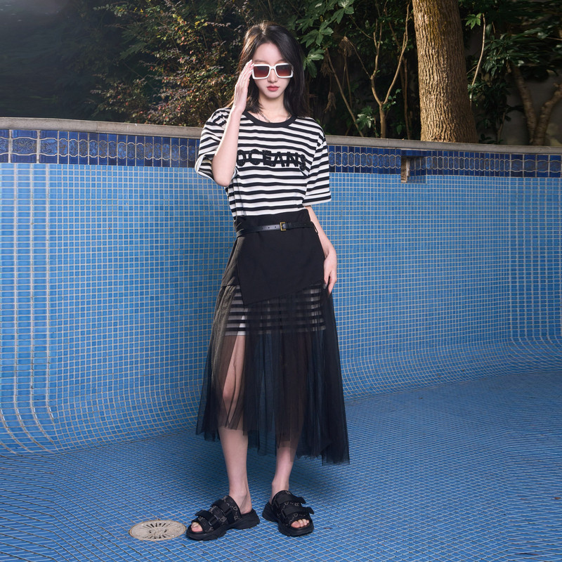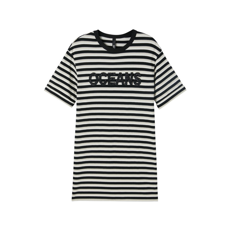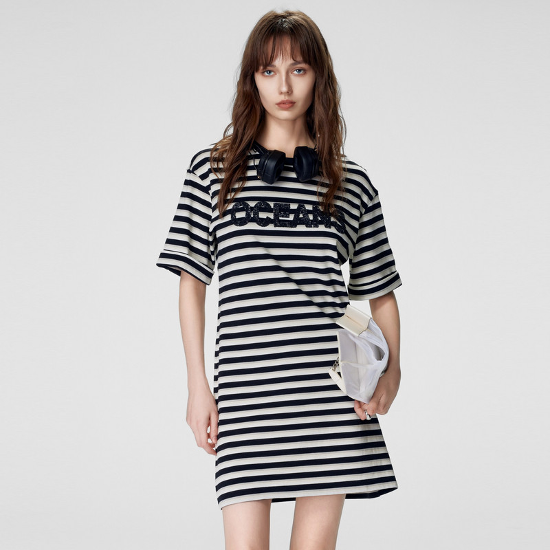 新款 夏季 百搭学院风休闲连衣裙尤缇时尚 TI黑白航海条纹T恤裙女