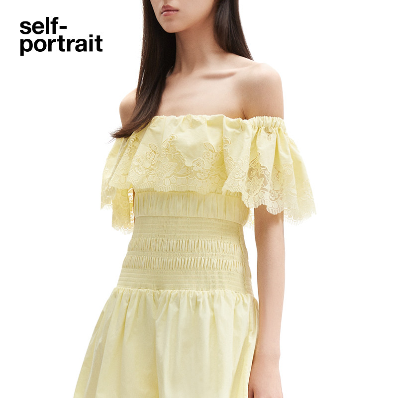 portrait self 春夏奶油黄一字肩收腰甜美连衣裙 松驰感假日