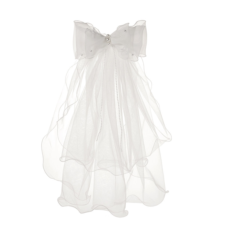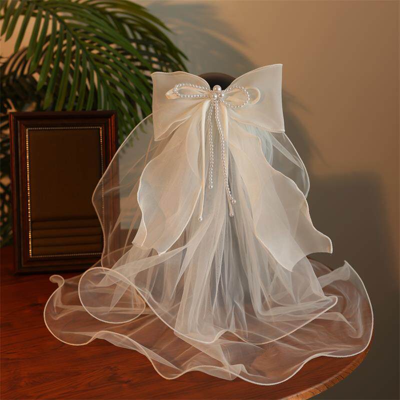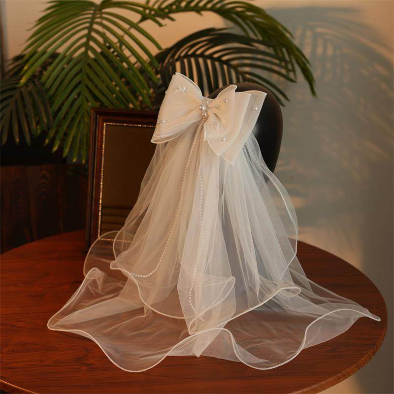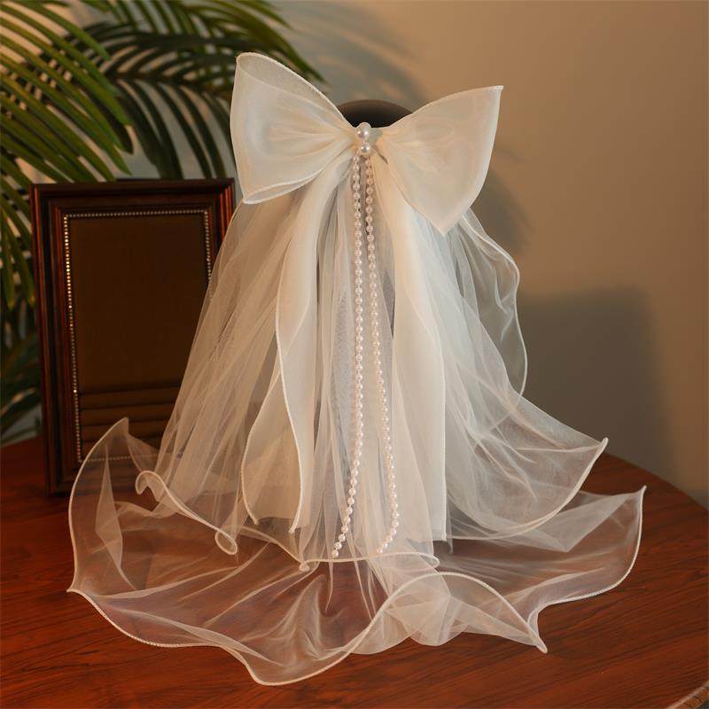 新娘结婚登记拍照道具 蝴蝶结领证头纱头饰简约短款 法式 公主同款