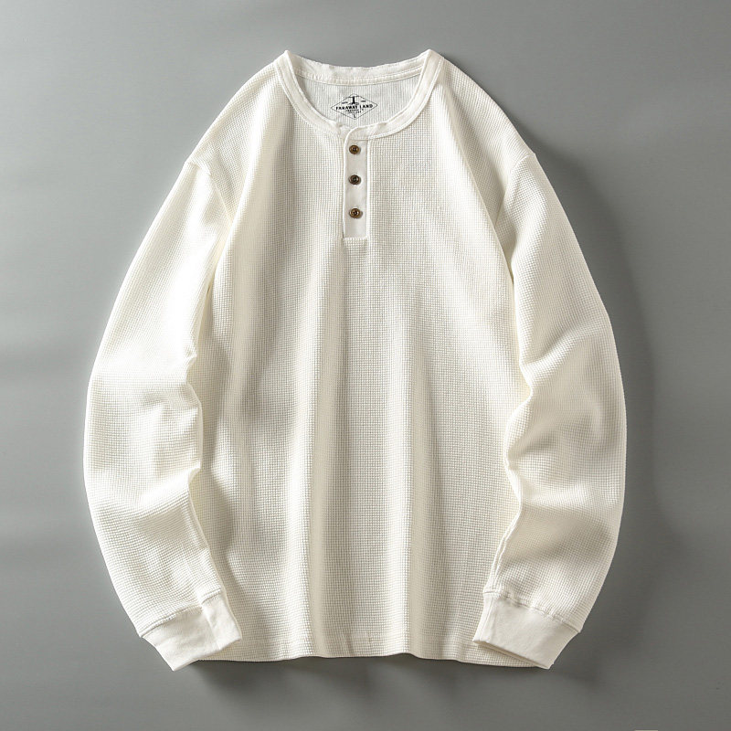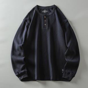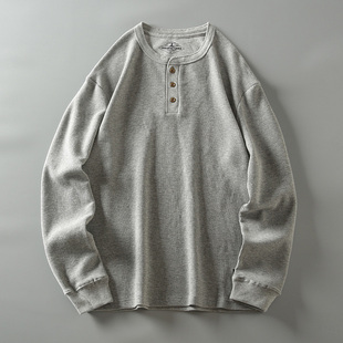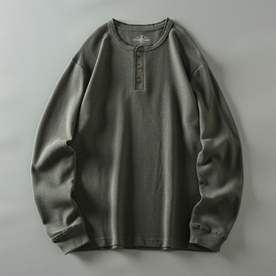 针织T恤打底衫 春秋季 休闲百搭长袖 复古咔叽华夫格亨利领男士 美式