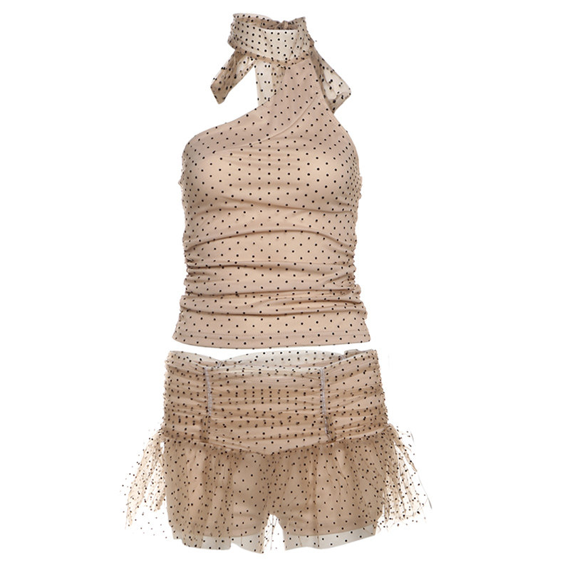 怪诞女孩 两件套女 纯欲复古薄纱波点斜肩挂脖背心高腰半身裙短裤