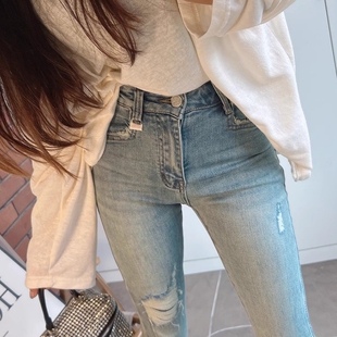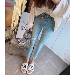 百搭九分铅笔裤 弹力修身 女春夏高腰紧身显瘦小脚裤 浅色破洞牛仔裤