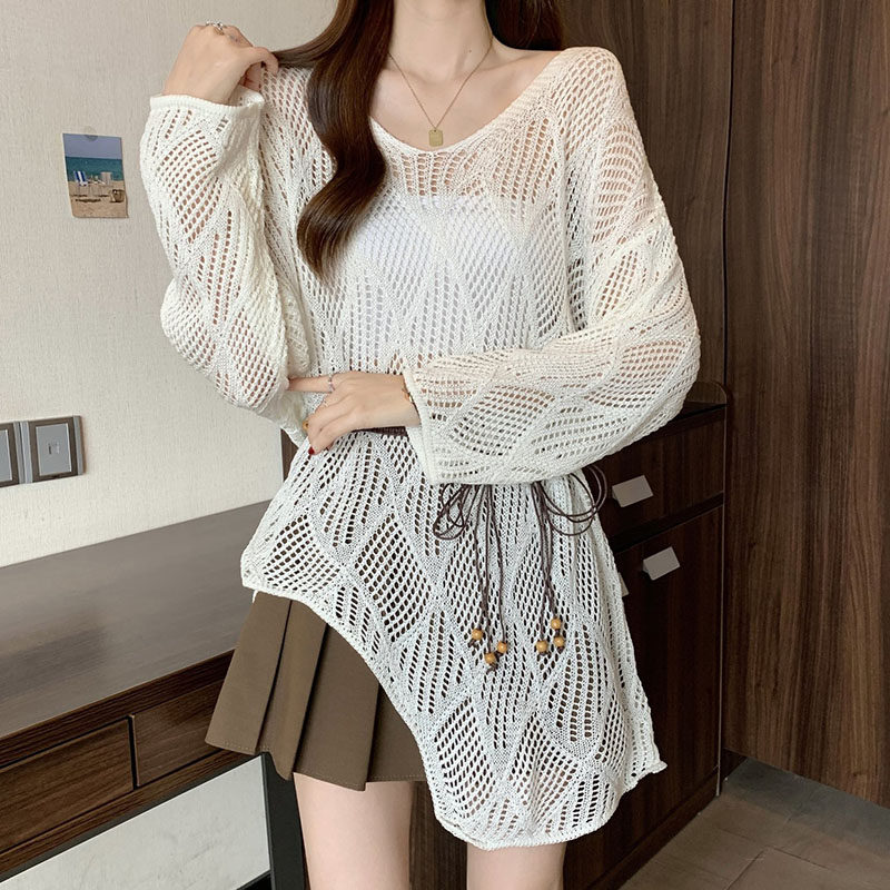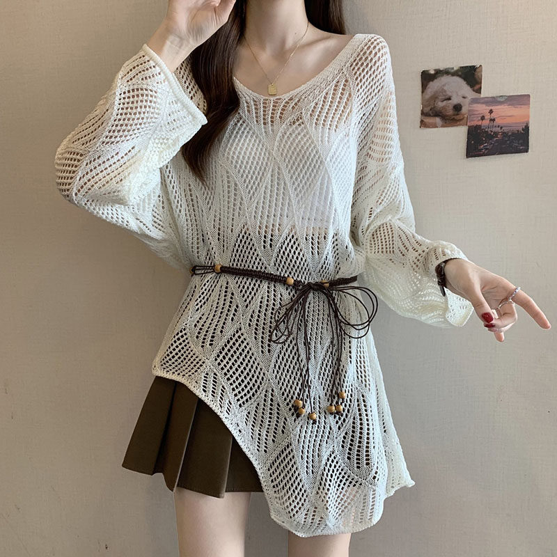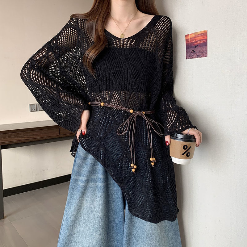 上衣 温柔风系带收腰空调衫 慵懒风钩花镂空小众针织罩衫 女春夏新款