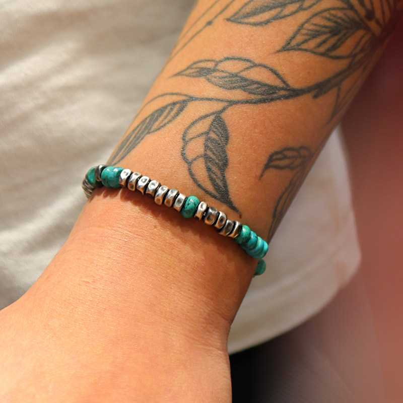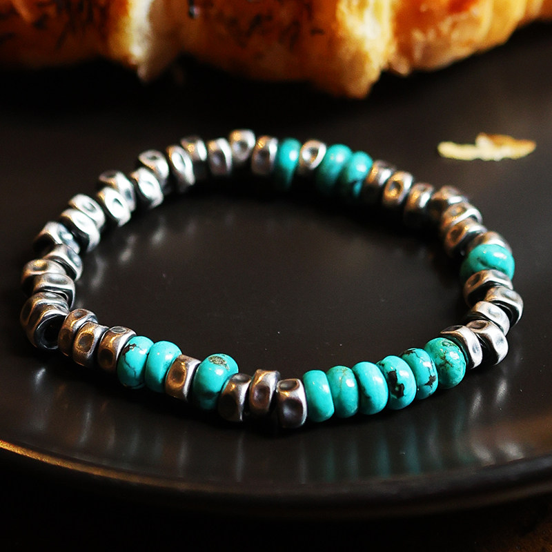 碎银子复古叠戴5MM捶打银盘缠925银手串小众绿松石设计手链嘻哈