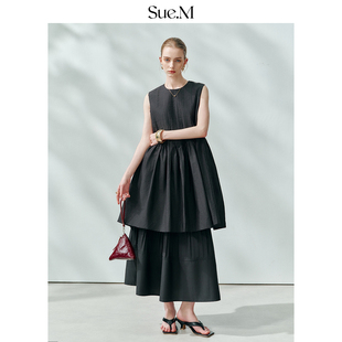 白鹿语撞色翻领拼接连衣裙春秋款 小黑裙长裙 设计感收腰显瘦长袖