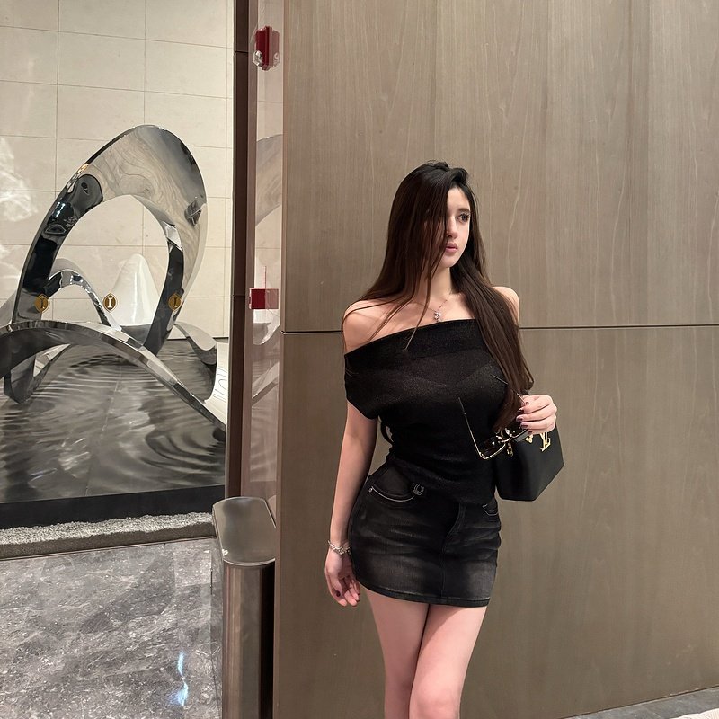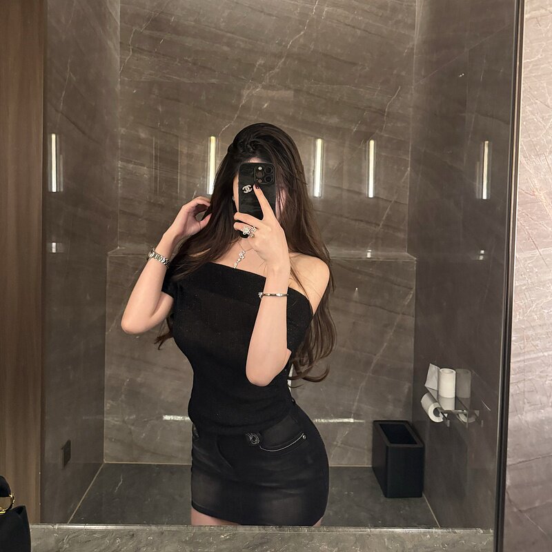 黑色体恤斜肩体恤露肩短款 夏季 2025新款 M900一字肩上衣t恤女短袖