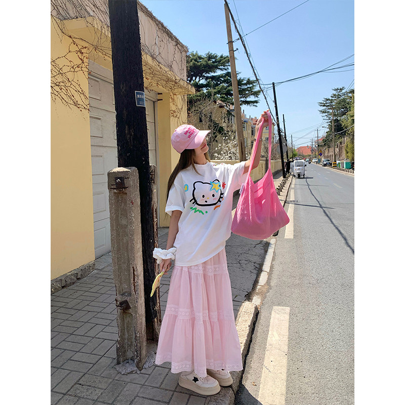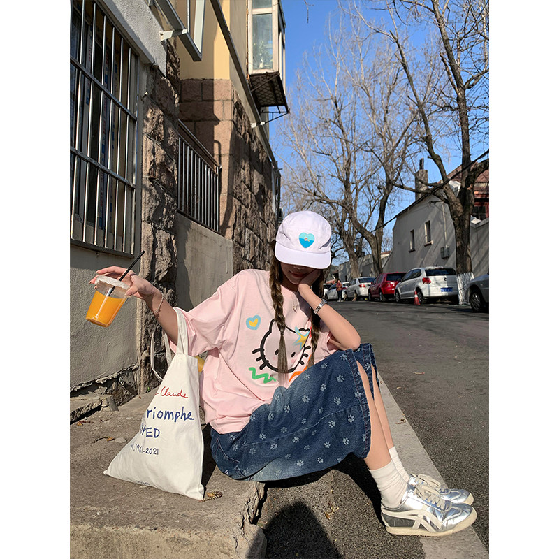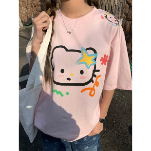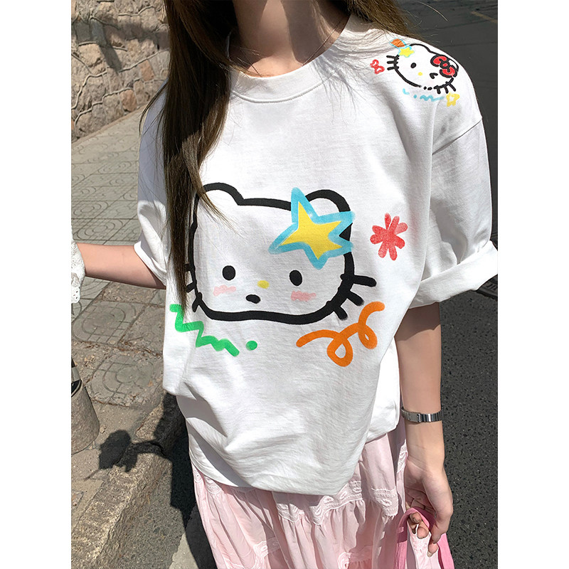 日系减龄可爱短袖 手绘呆萌猫咪印花宽松T恤夏季 CCKOK 女 现货