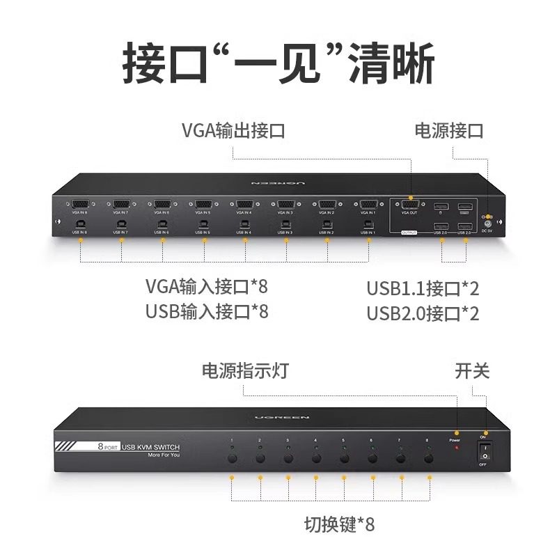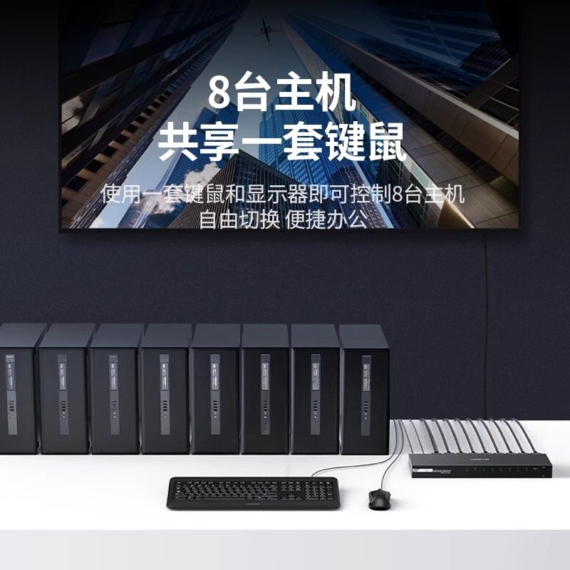 绿联 kvm切换器VGA八进一出多台电脑主机共用一个显示器转换分频器音视频同步键盘鼠标打印机共享器可挂机柜
