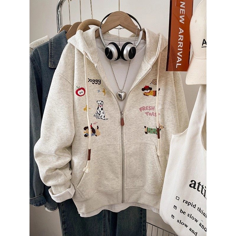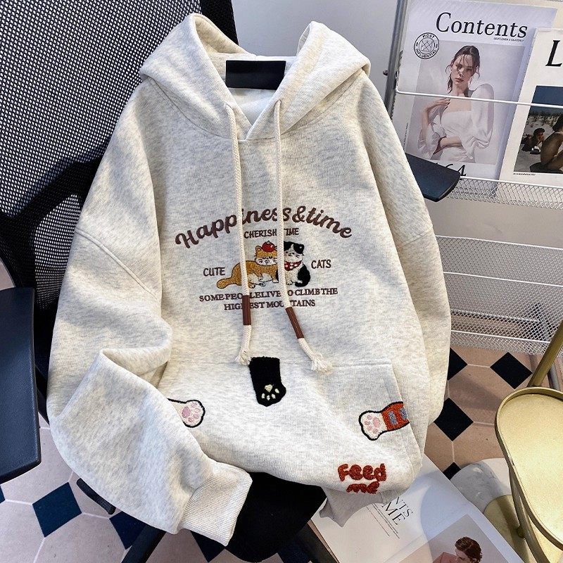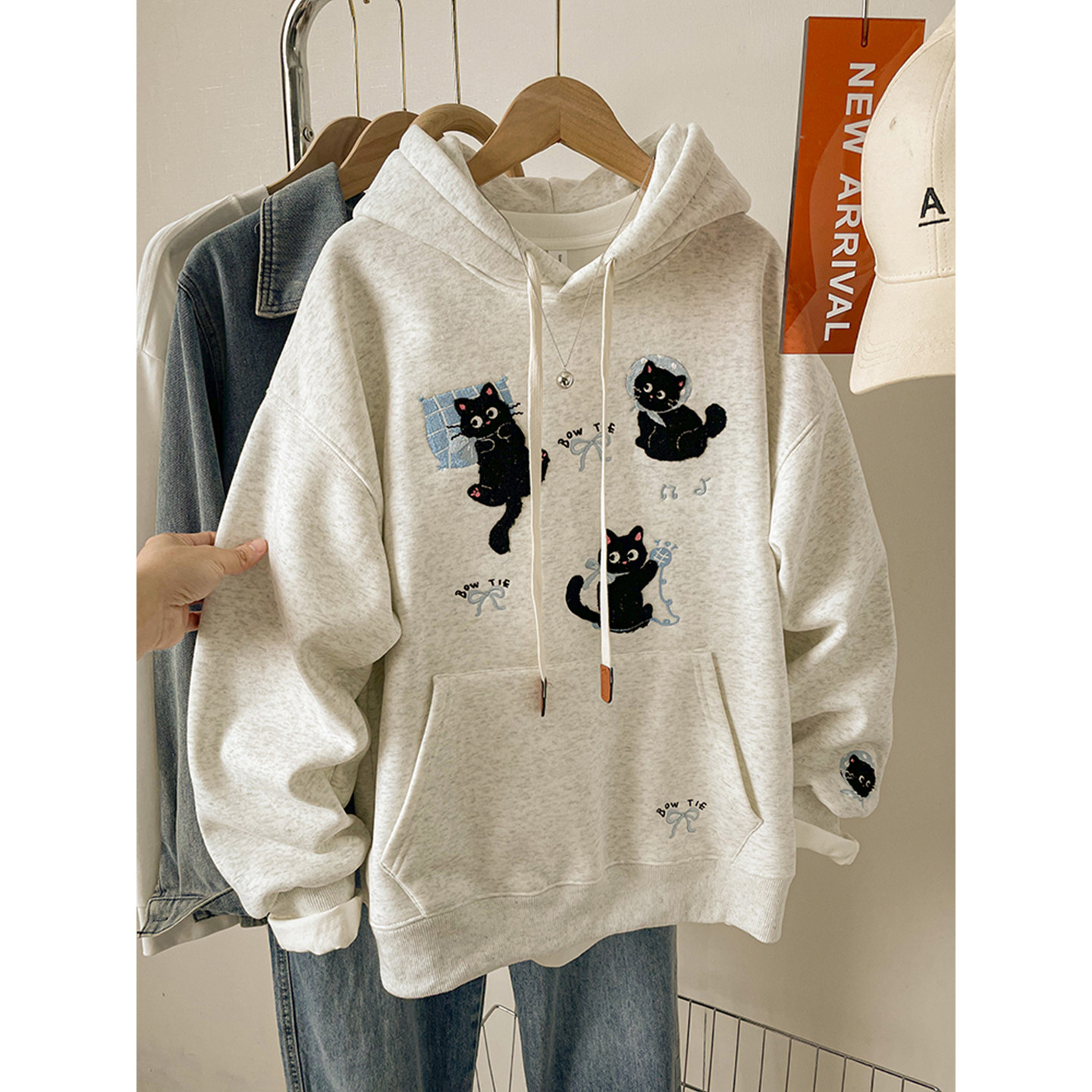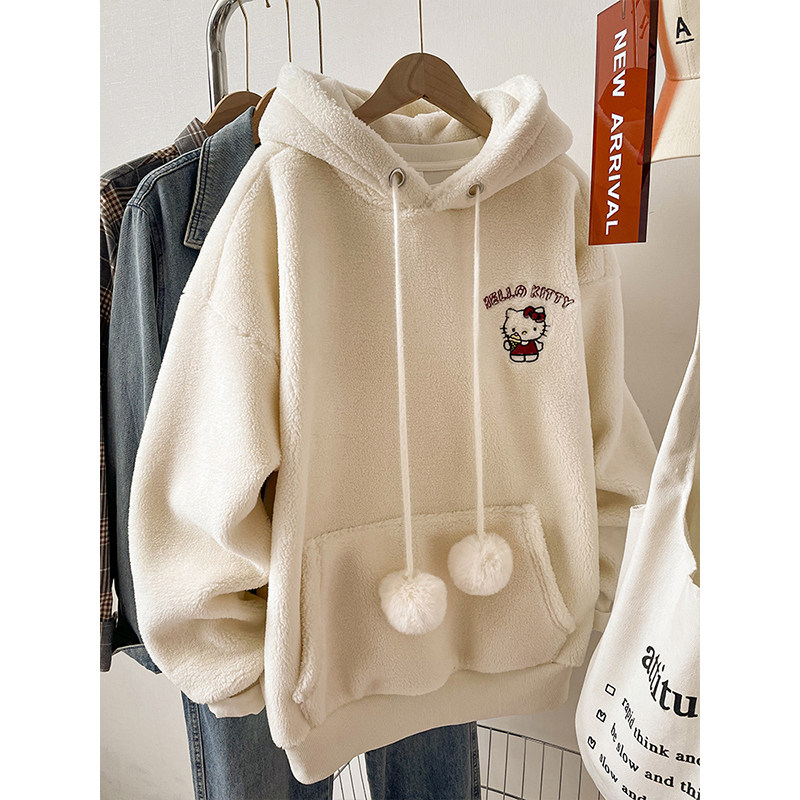 奶fufu羊羔毛刺绣kt猫卫衣外套女秋冬季 可爱日系加绒加厚连帽上衣