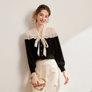 白鹿语法式 上衣春秋优雅设计感系带蝴蝶结衬衣女 拼接镂空衬衫