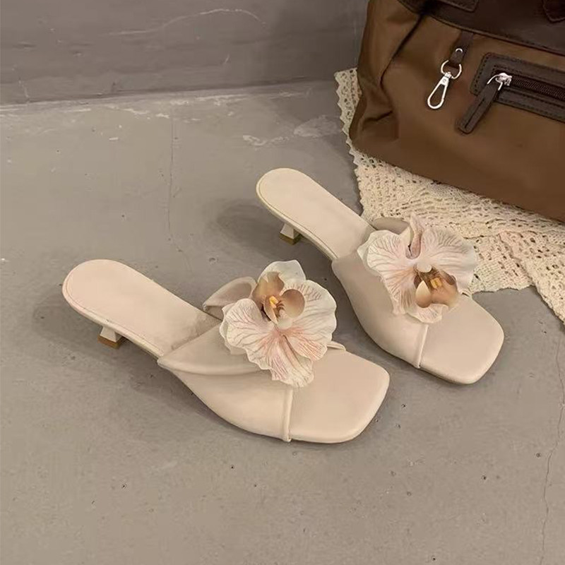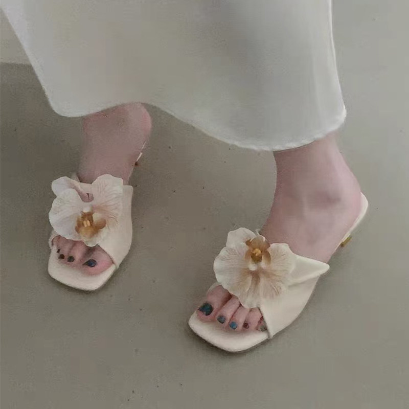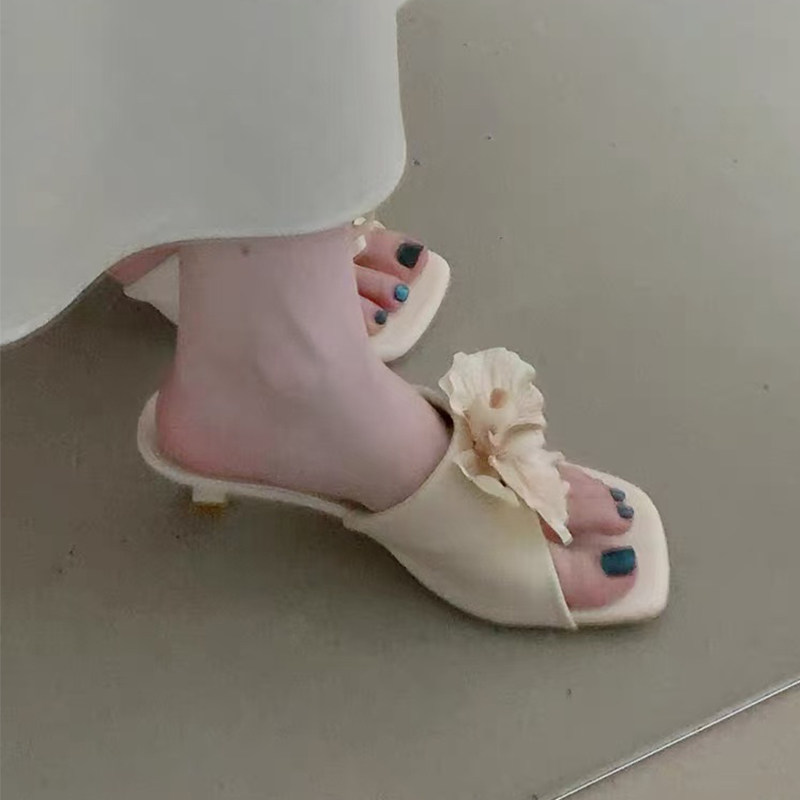 舒适方头露趾粗跟外穿半拖高跟鞋 新款 女2026夏季 泰国小众花朵凉鞋
