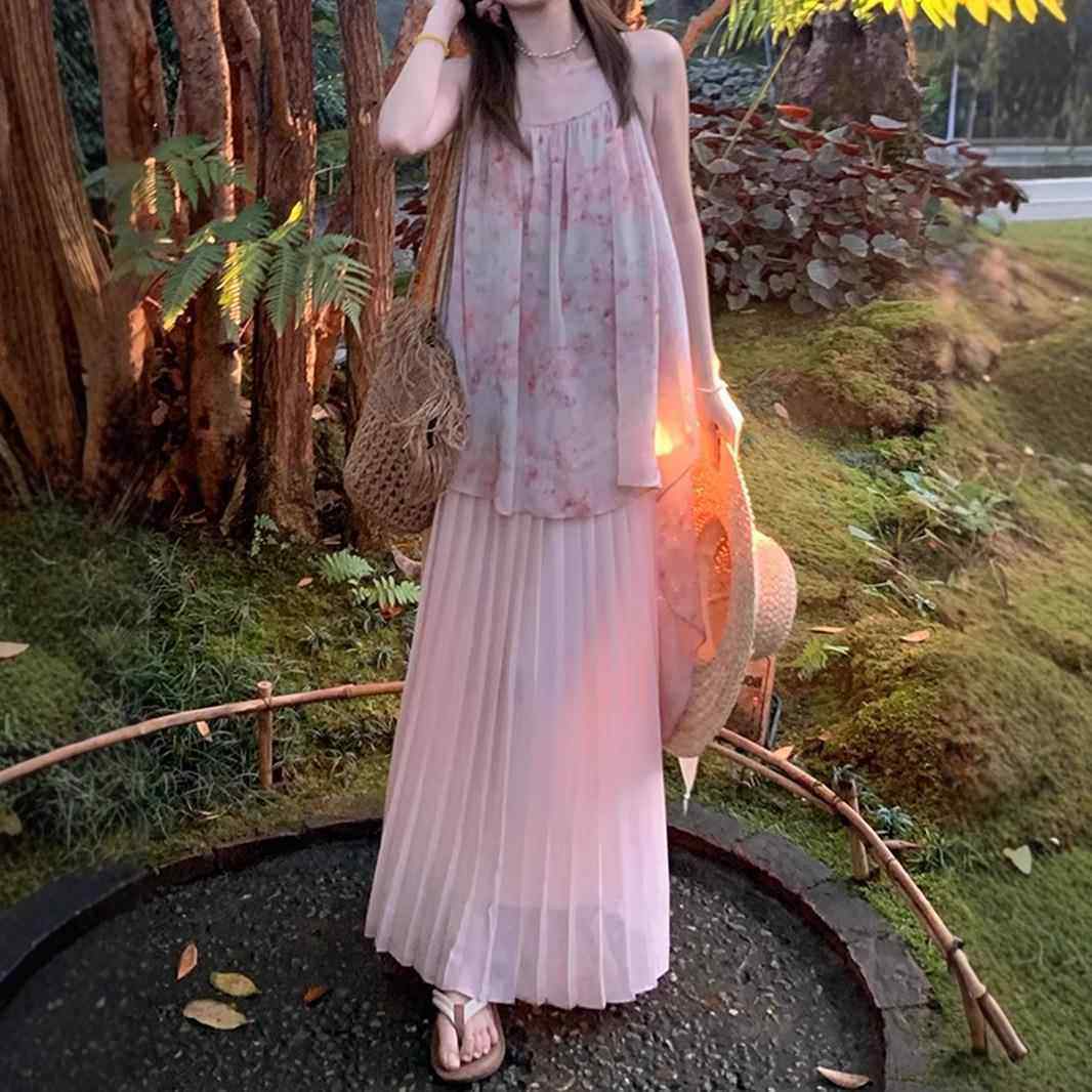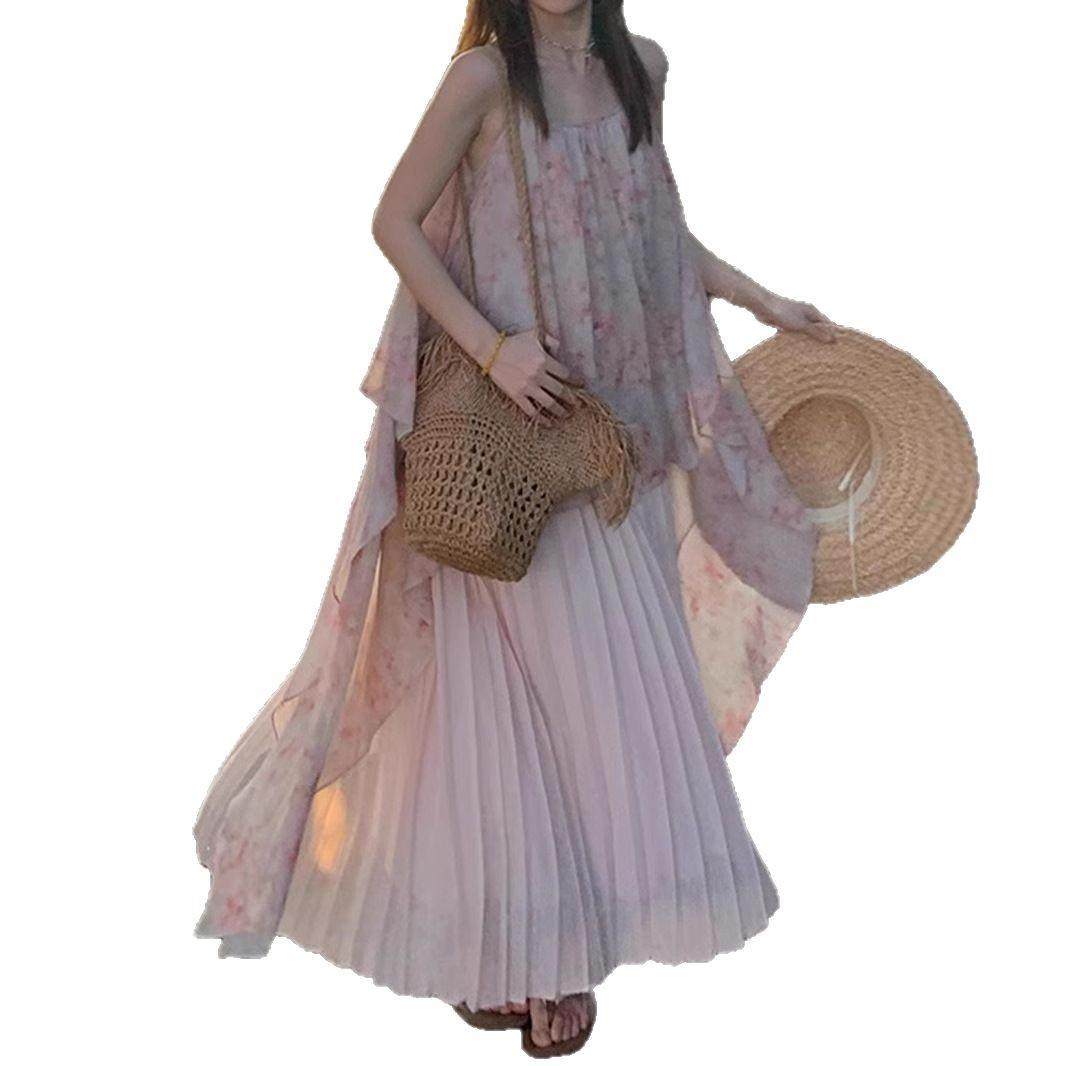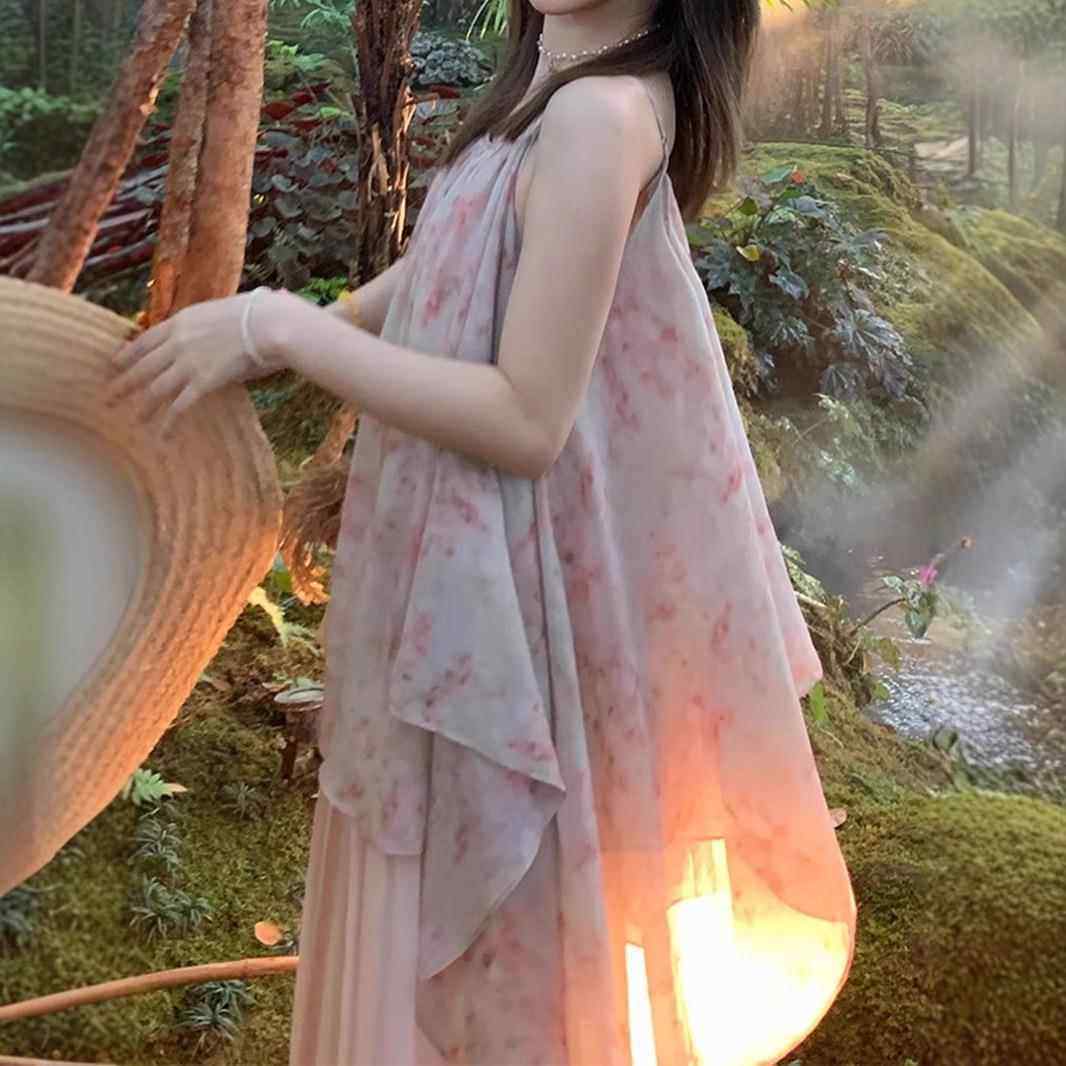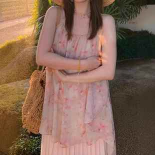 2025新款 小个子春夏海边度假风晕染碎花吊带连衣裙 桃之夭夭