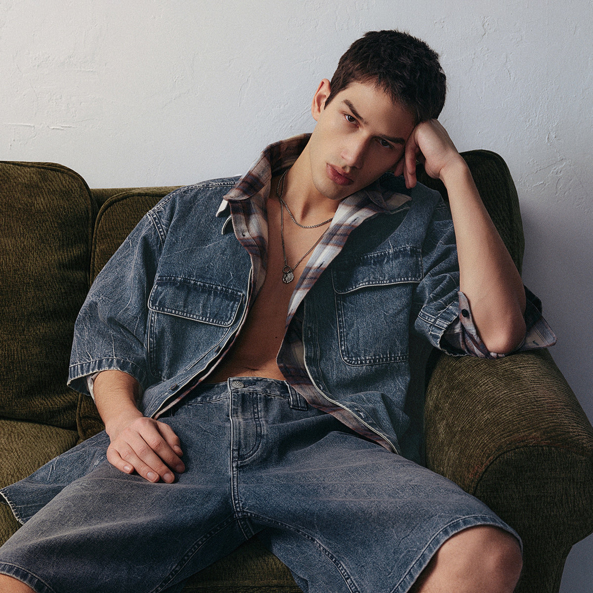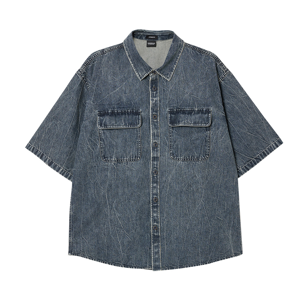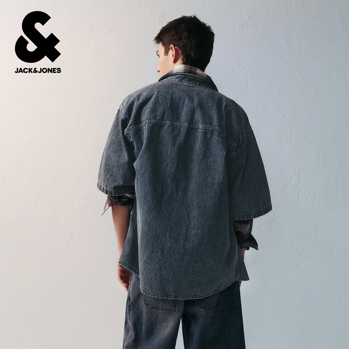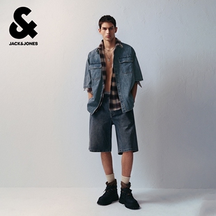 jq区绫致杰克琼斯男夏潮酷高街尖领贴袋宽松休闲牛仔短袖 上衣 衬衫