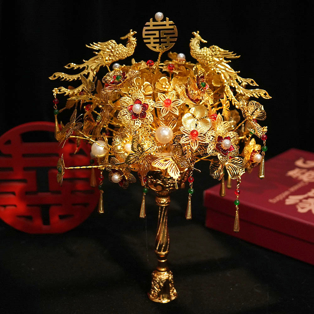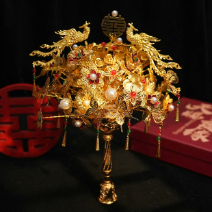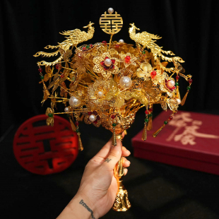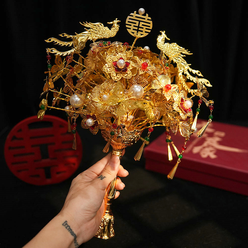 金色手捧花新娘中式 婚礼秀禾旗袍服龙凤褂晨袍汉服饰品红绿水钻