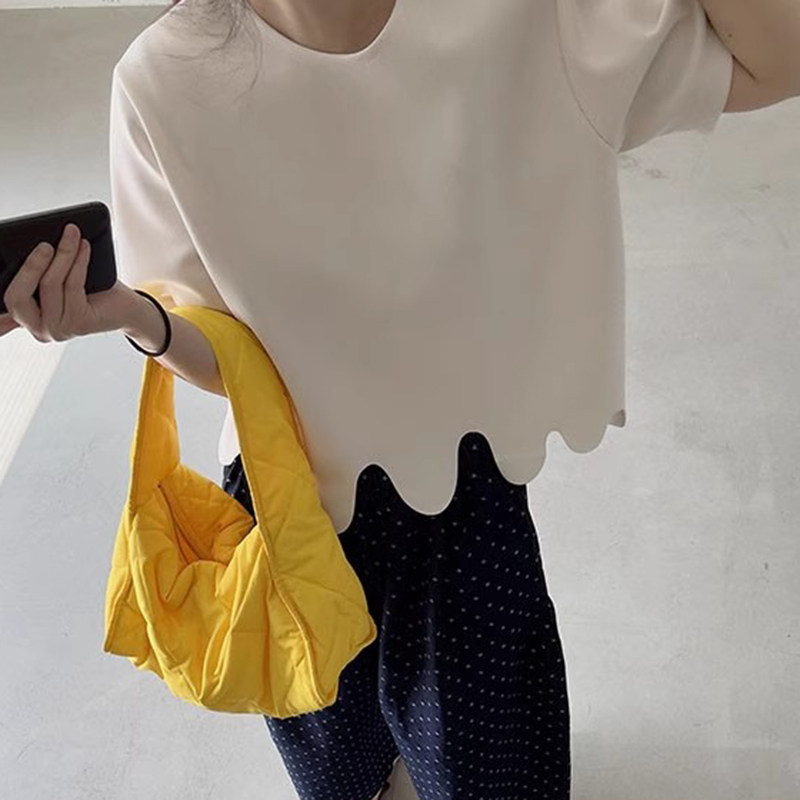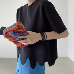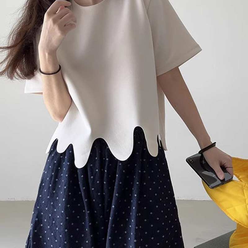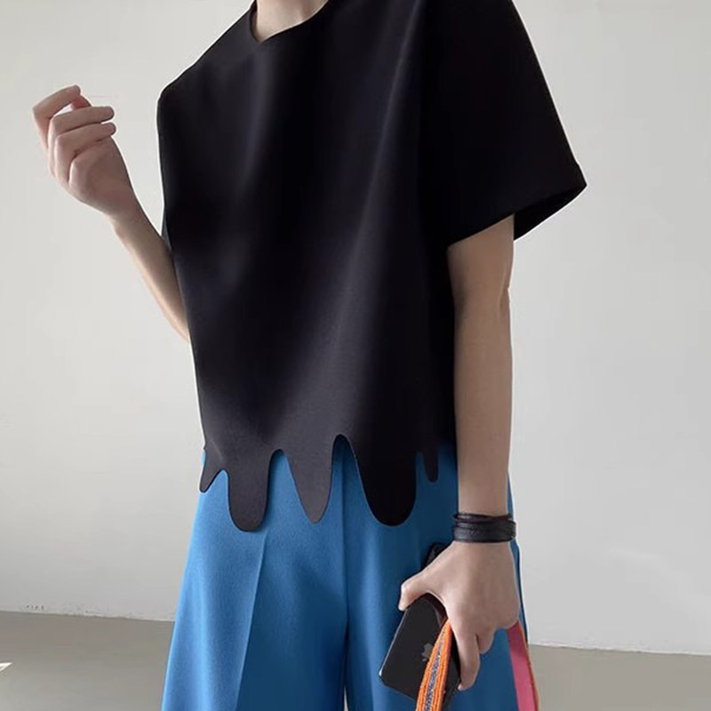 韩国chic夏季 T恤上衣 小众设计感圆领不规则波浪花纹宽松百搭短袖