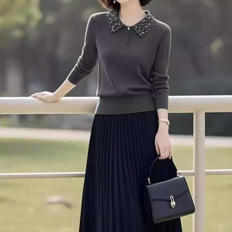 polo领针织上衣百褶半身裙套装 新款 原创品牌2025秋季 素雅订制女装