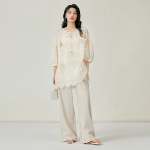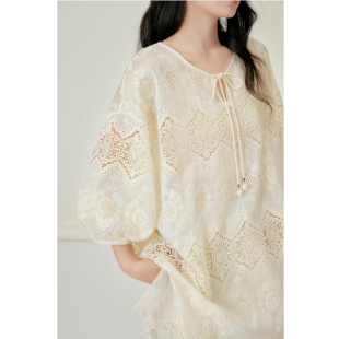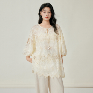 高级花边下摆短袖 Basic 夏季 百家好莱赛尔提花镂空衬衫 上衣 House