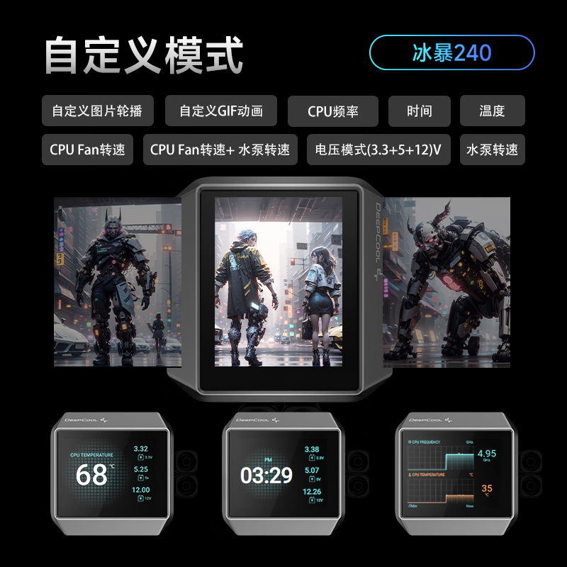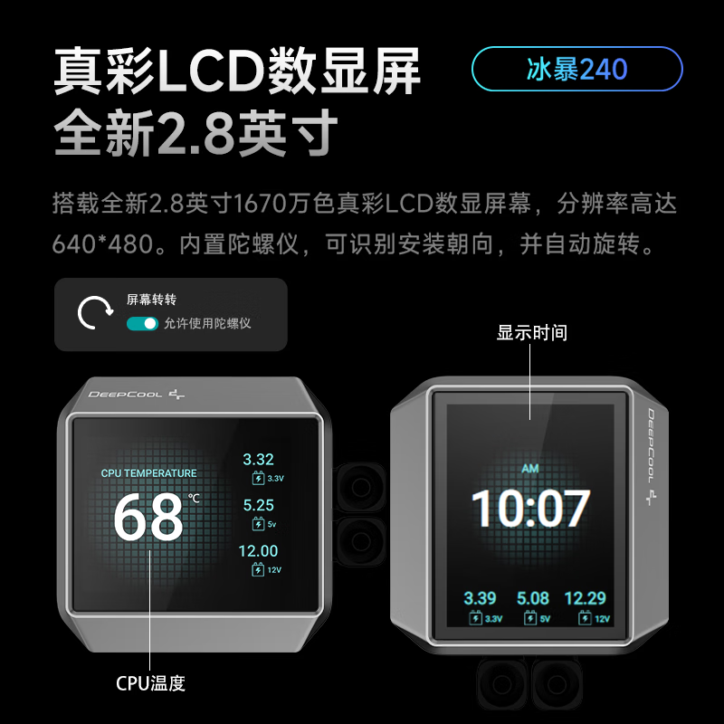 九州风神240冰暴LCD屏显水冷散热器2.8英寸真彩LCD屏 5代高能水泵
