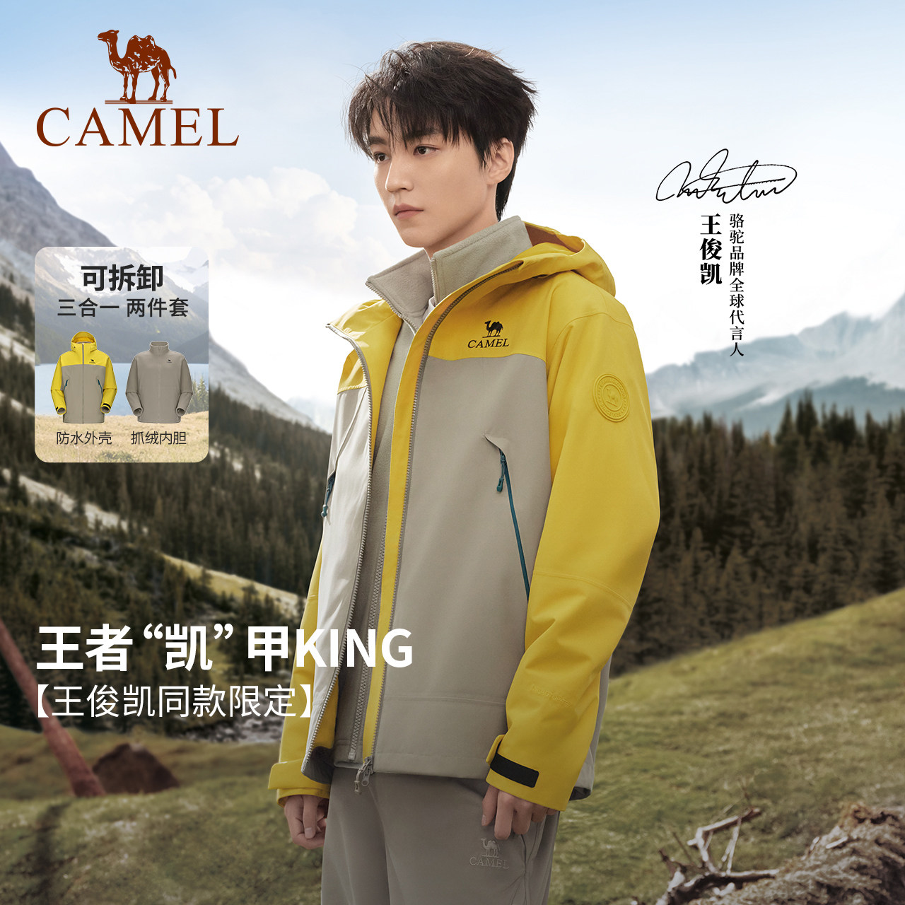 新款 骆驼王者凯甲KING冲锋衣三合一女春季 防风防水外套 轻霜白