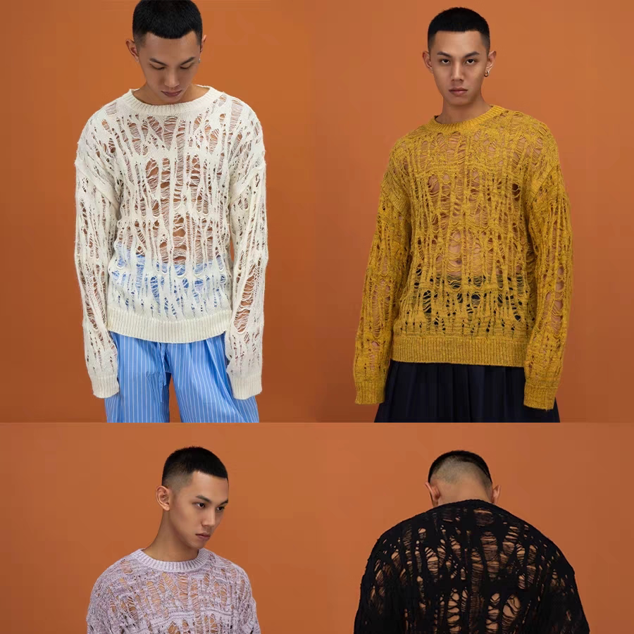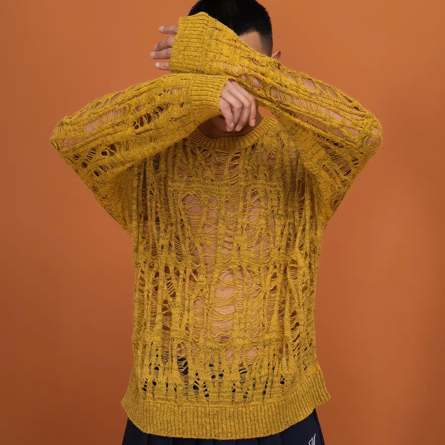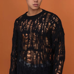 乞丐毛衫 欧美多巴胺镂空针织衫 个性 防晒罩衫 潮 男透视性感宽松长袖