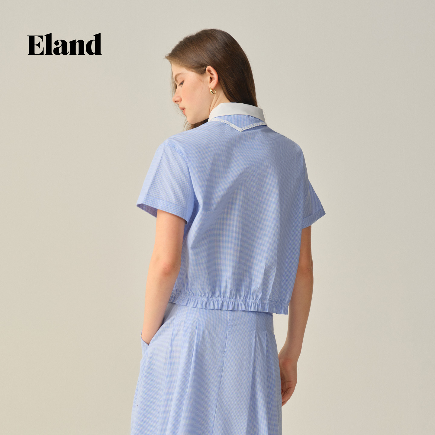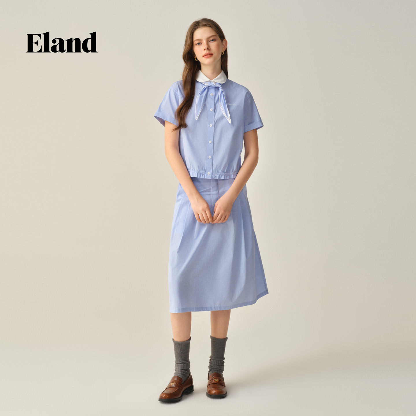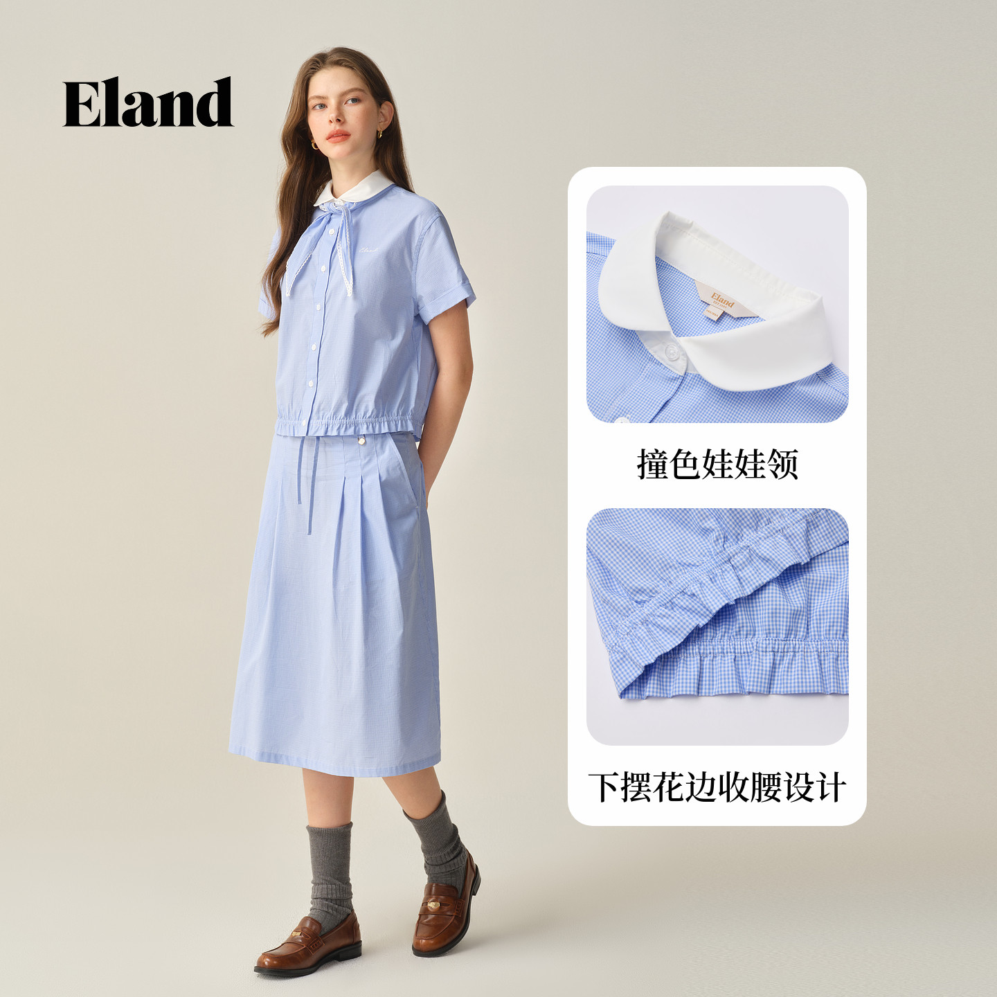 带领结格纹上衣冬季 女休闲短袖 Eland衣恋衬衫 新款 初见衫