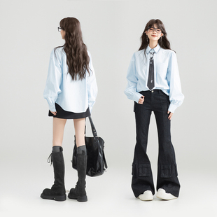 美式 热风长袖 新款 上衣2026年春季 复古胸前口袋牛仔衬衣 牛仔衬衫