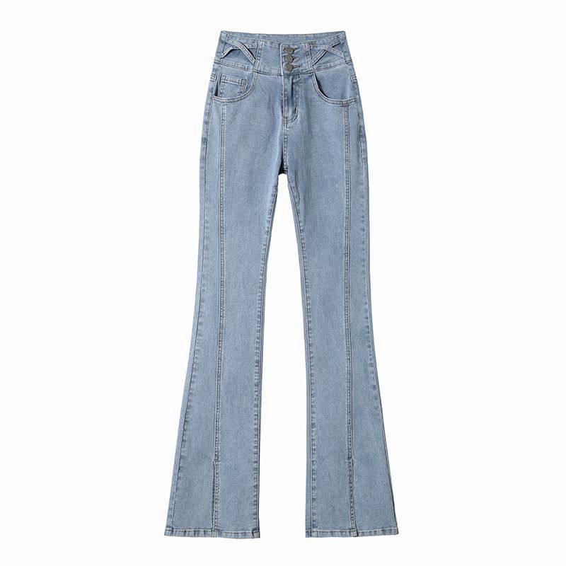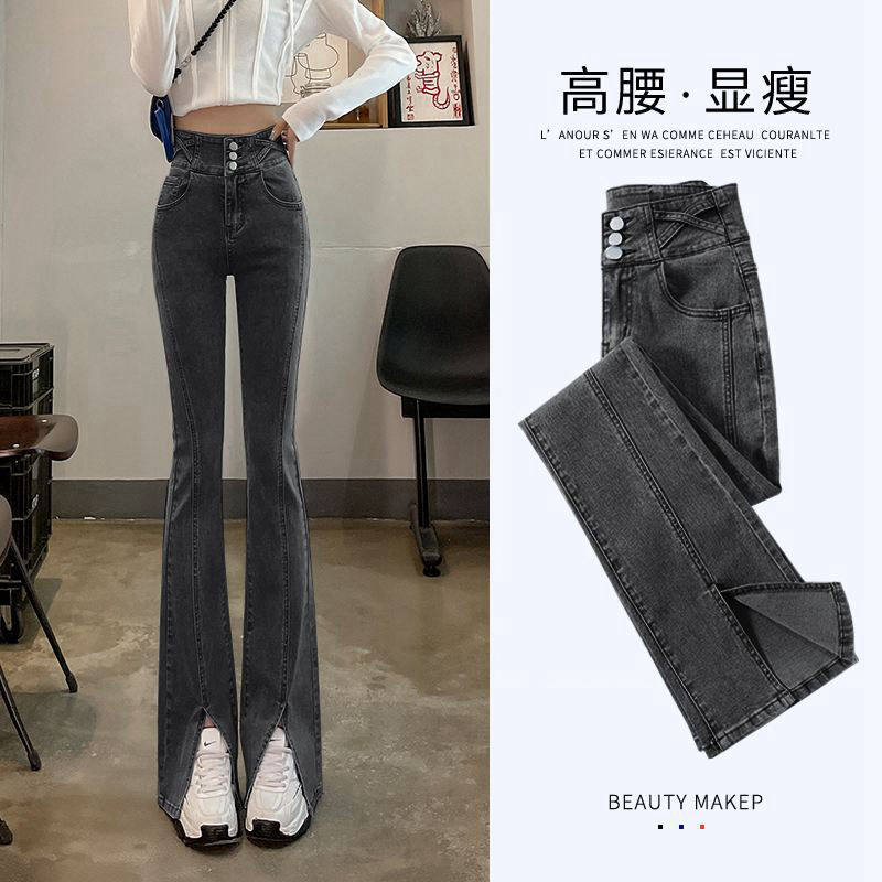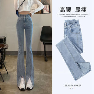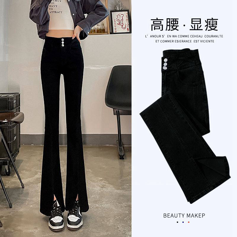 女2025秋冬加绒高腰弹力显瘦微喇裤 黑色喇叭牛仔裤 子 焊在腿上